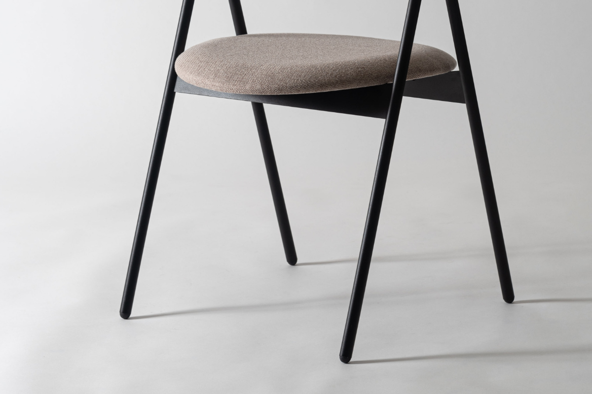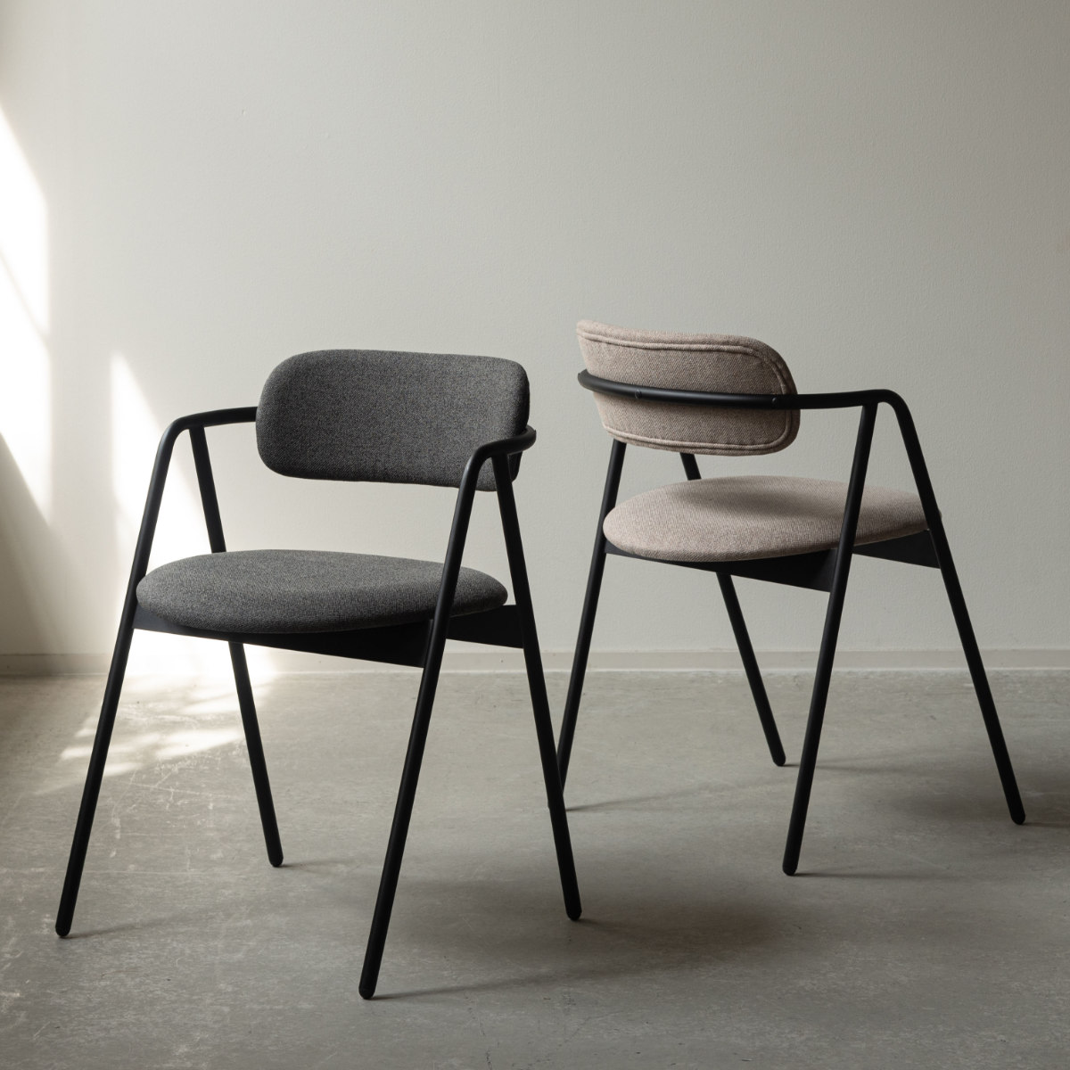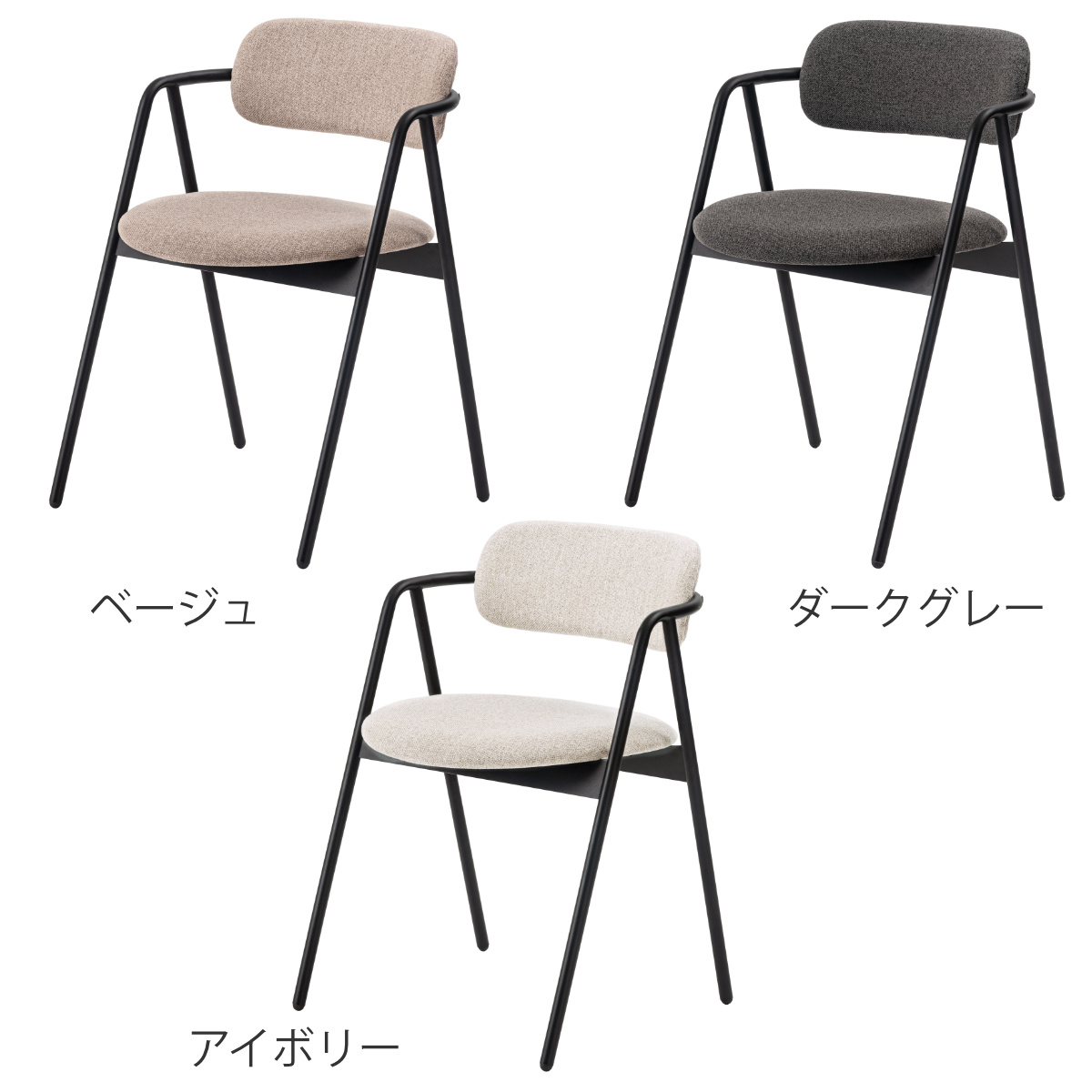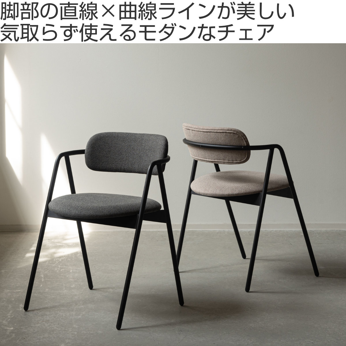 ブラックスチールの脚部が全体を引き締め、洗練された印象のチェアです。ファブリック座面を組み合わせることで、ほどよいカジュアルさをプラス。スタイリッシュでありながら気取らず、さまざまなインテリアに取り入れやすい一脚です。