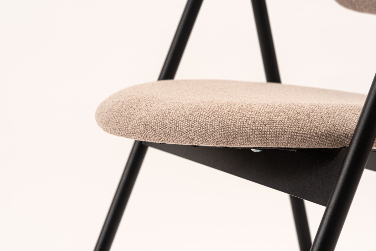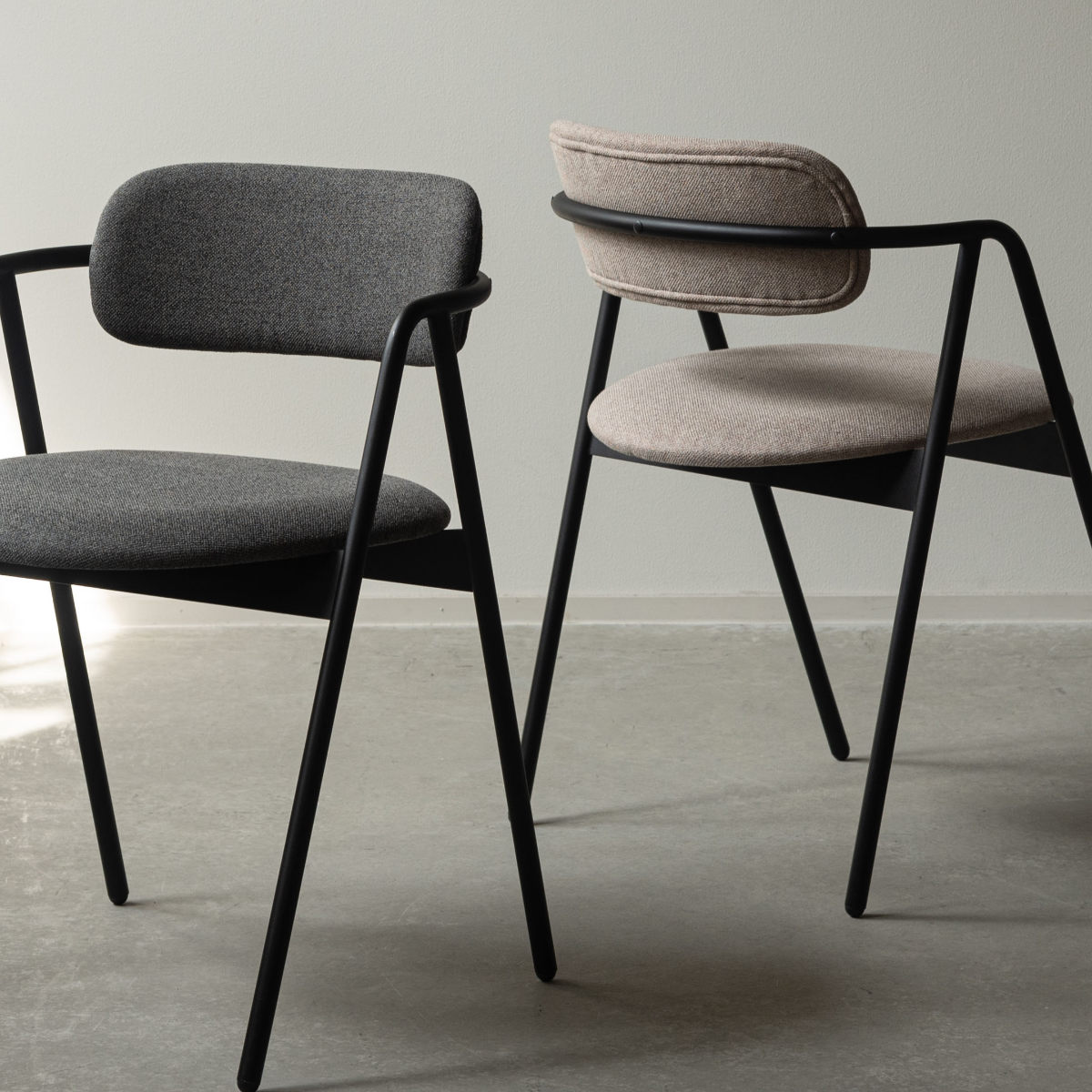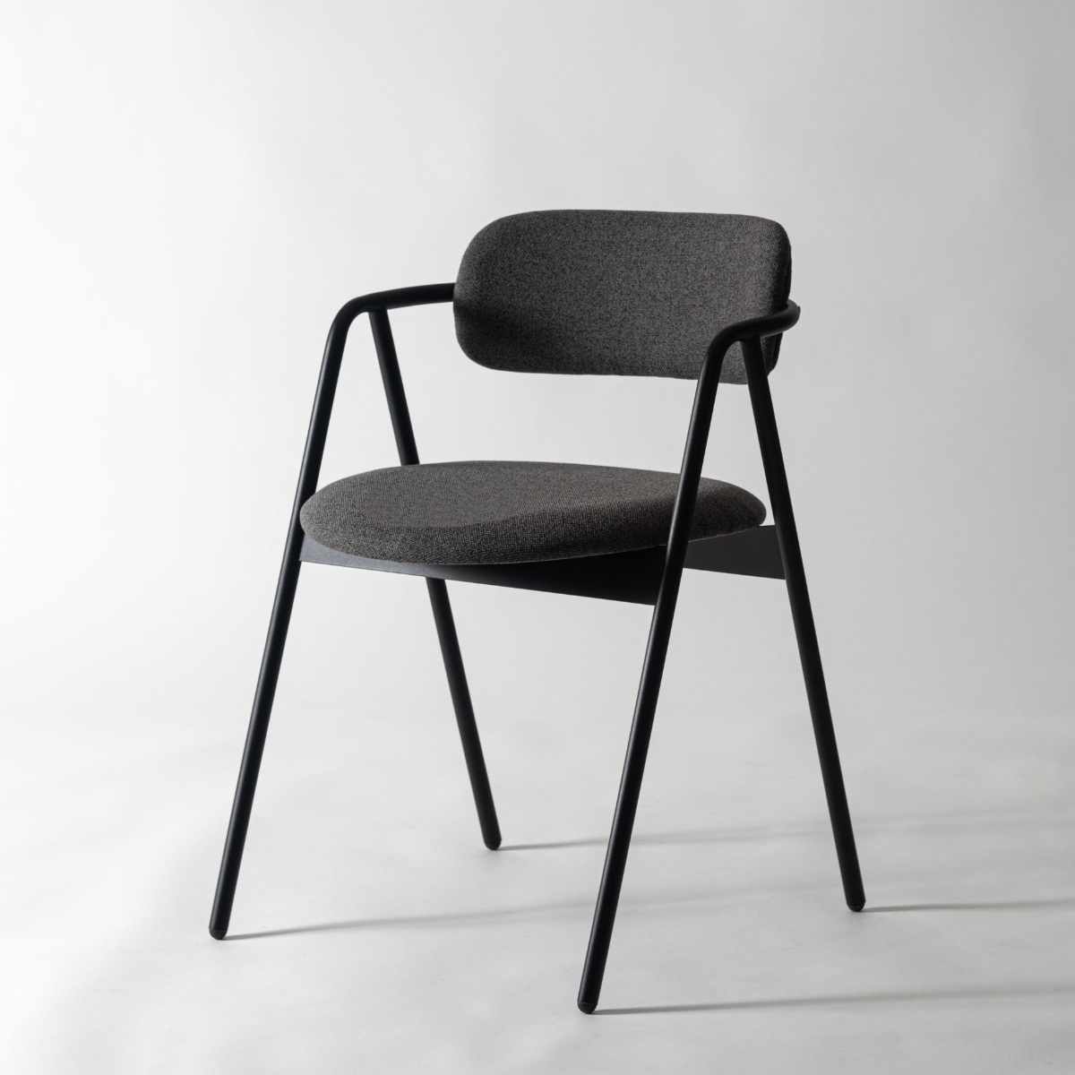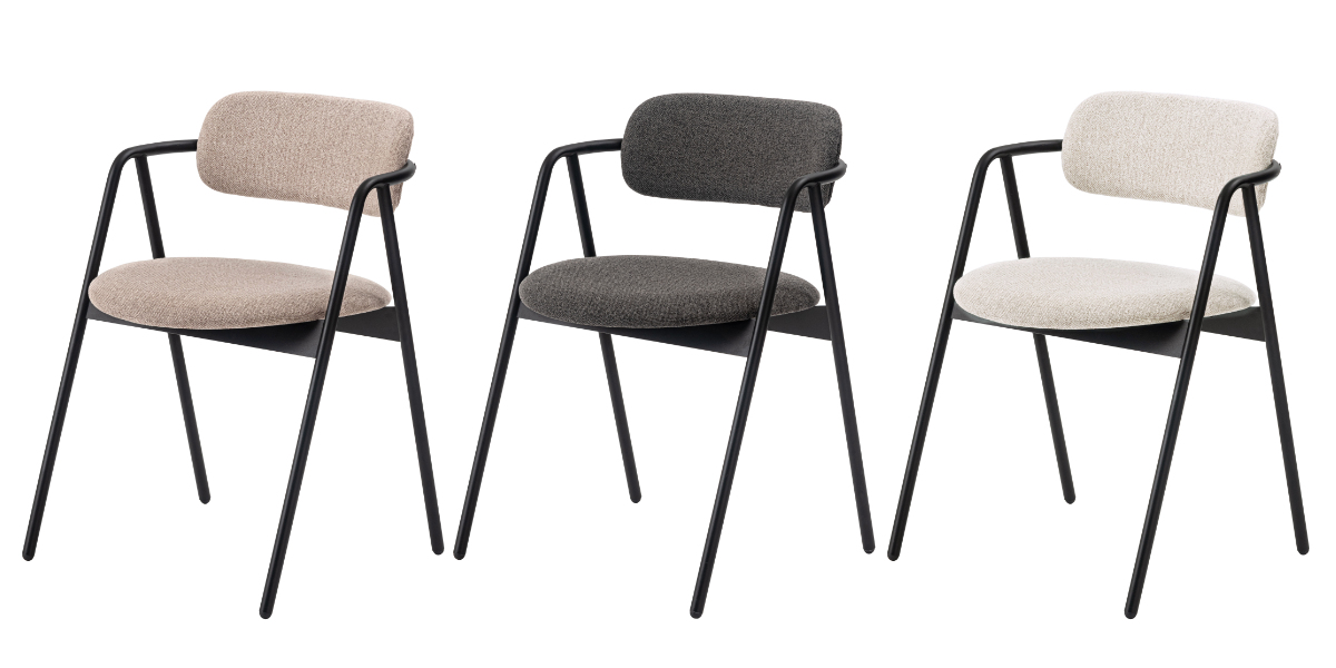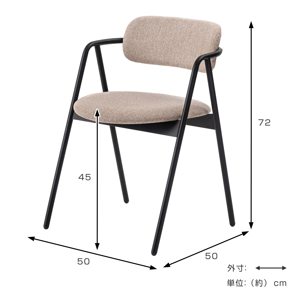 ブラックスチールの脚部が全体を引き締め、洗練された印象のチェアです。ファブリック座面を組み合わせることで、ほどよいカジュアルさをプラス。スタイリッシュでありながら気取らず、さまざまなインテリアに取り入れやすい一脚です。