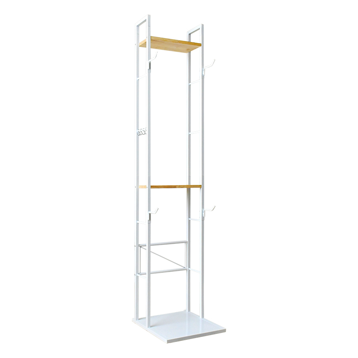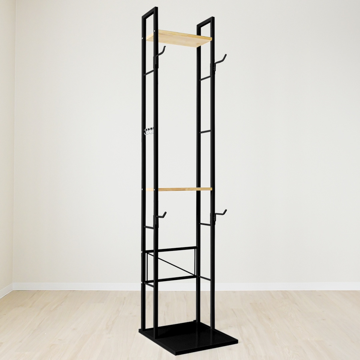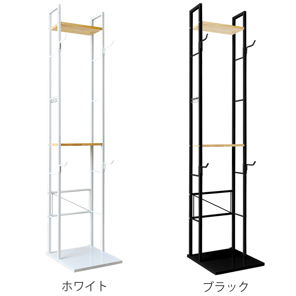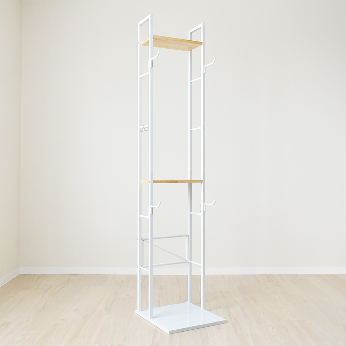 上部には天然木を使用した木棚を2枚備え、S字フック4個が付属しています。ヘルメットやグローブなどの自転車小物の収納はもちろん、グリーンや雑貨を置いてディスプレイ棚としても楽しめます。
