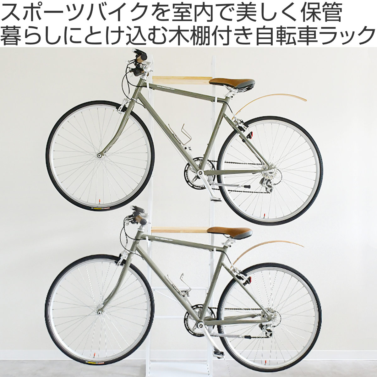 大切なスポーツバイクを室内で美しく保管できる自転車スタンドです。室内で保管することで、雨風によるサビや転倒の心配を軽減し、盗難やイタズラ対策にも効果的です。小物収納ができる木棚付きで、インテリアとしても空間に心地よくなじみます。