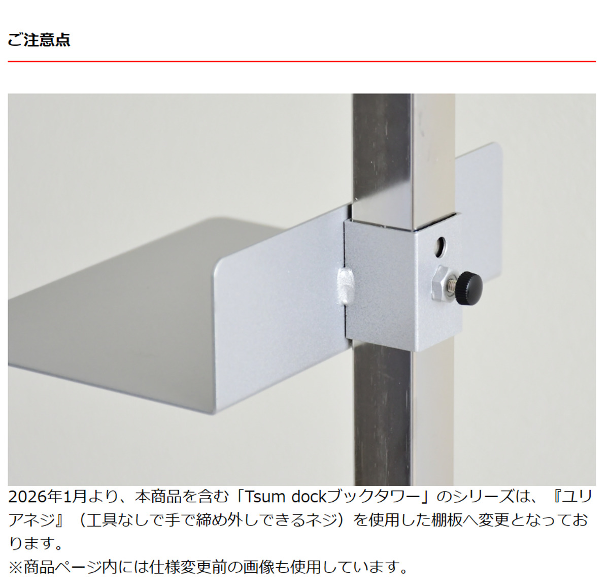 2026年1月より、本商品を含む「Tsum dockブックタワー」のシリーズは、『ユリアネジ』(工具なしで手で締め外しできるネジ)を使用した棚板へ変更となっております。
