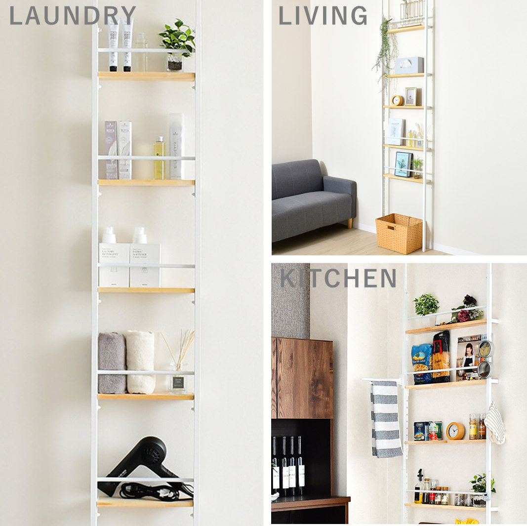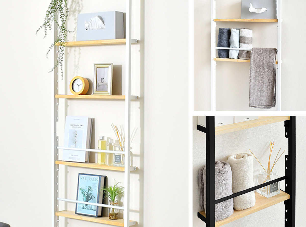 天然木の棚板とシンプルなスチールパイプを組み合わせた、ナチュラルな印象のウォールラックです。突っ張りタイプで壁面を有効活用でき、収納が欲しい場所に手軽に設置できます。