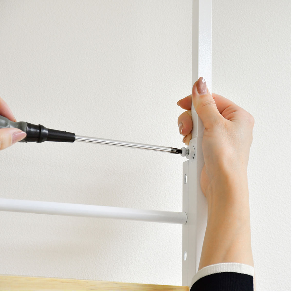 【3】バーを天井にグッと押し当てて、高さ固定ネジを締めます。