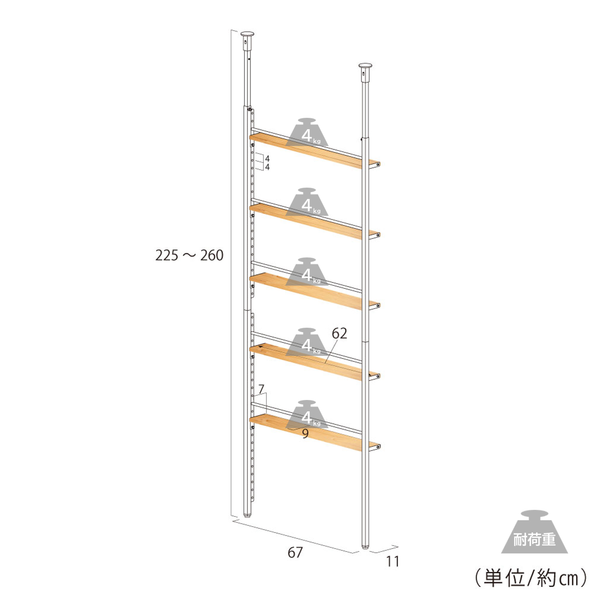 | サイズ | 【本体】幅70×奥行12.5×高さ225~260(cm) 【棚】幅62×奥行9×高さ2(cm) 棚板有効幅:約61(cm) |