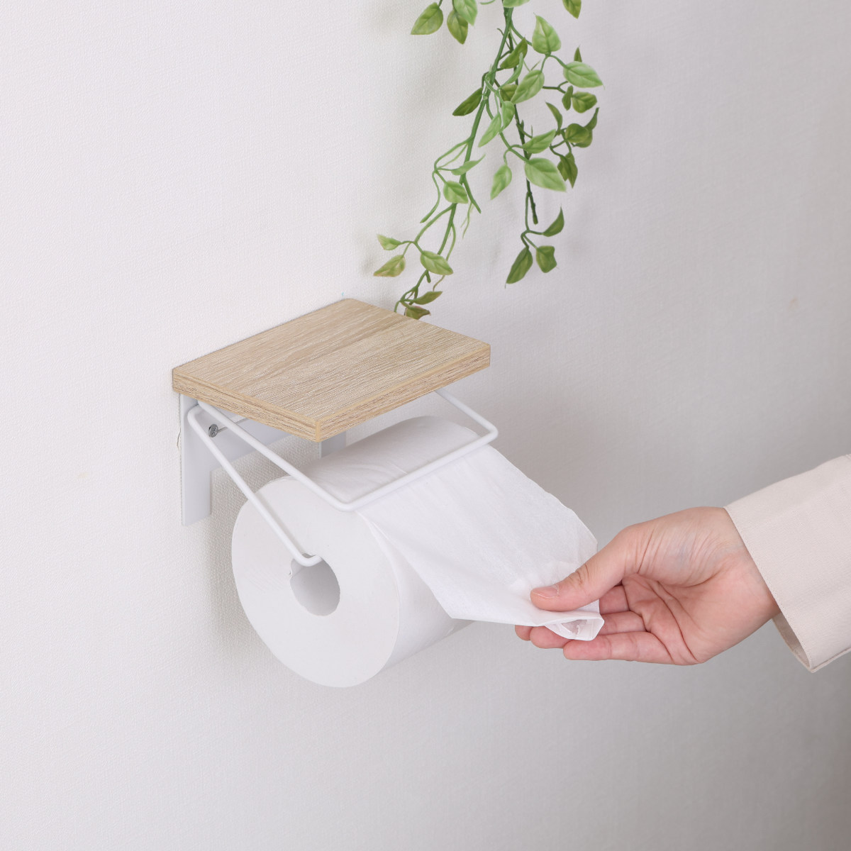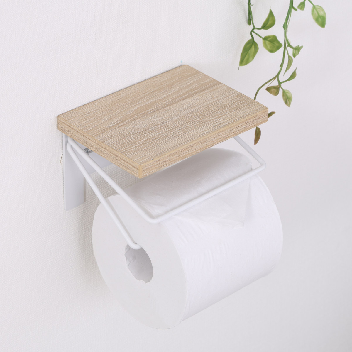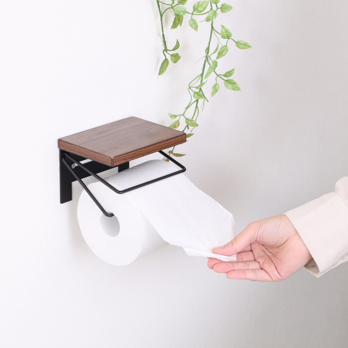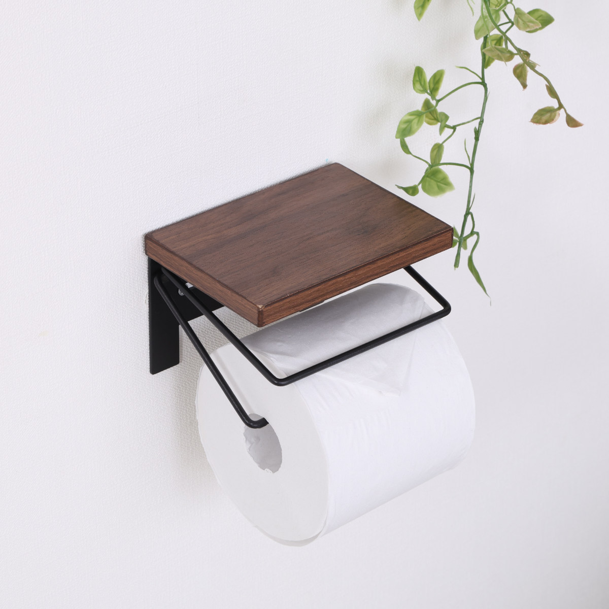 木のぬくもりを感じる木目天板と、無骨なワイヤーを組み合わせたトイレットペーパーホルダーです。ナチュラルさとヴィンテージ感を併せ持ち、トイレ空間におしゃれなアクセントを加えます。