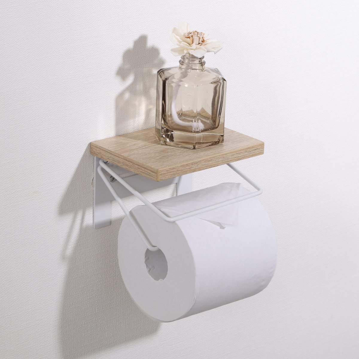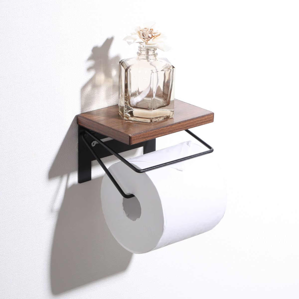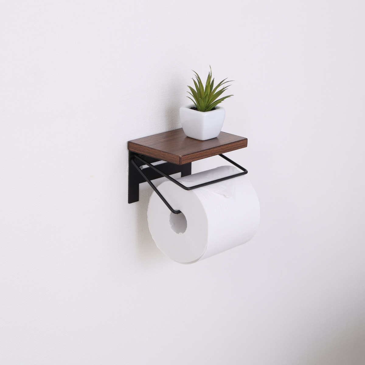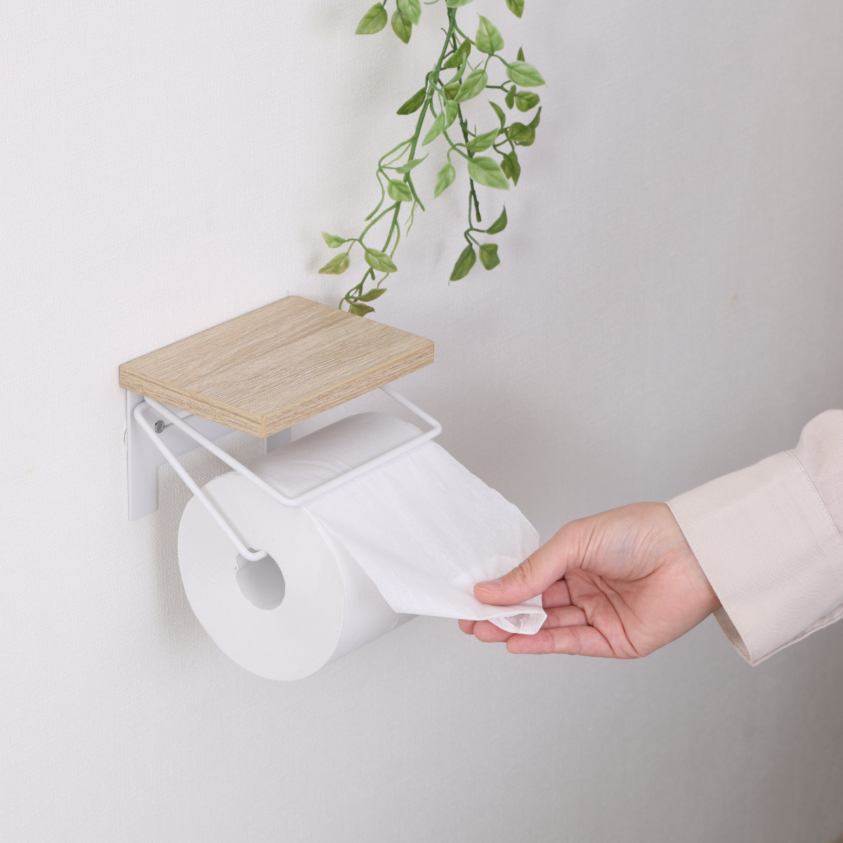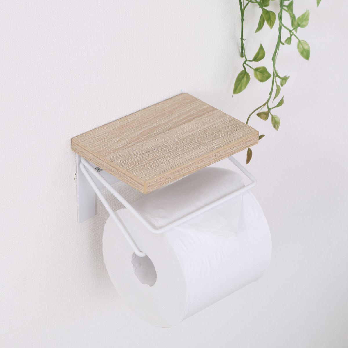 木のぬくもりを感じる木目天板と、無骨なワイヤーを組み合わせたトイレットペーパーホルダーです。ナチュラルさとヴィンテージ感を併せ持ち、トイレ空間におしゃれなアクセントを加えます。