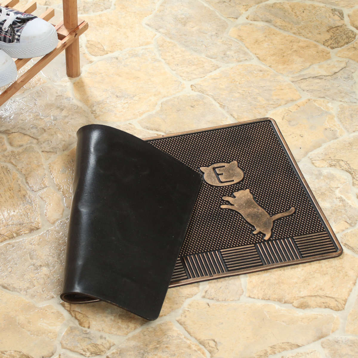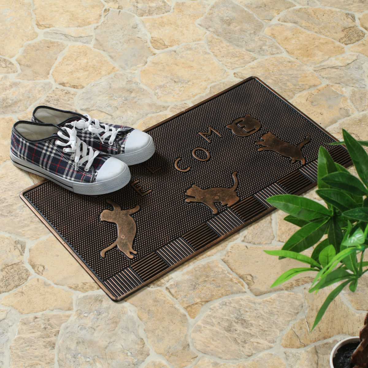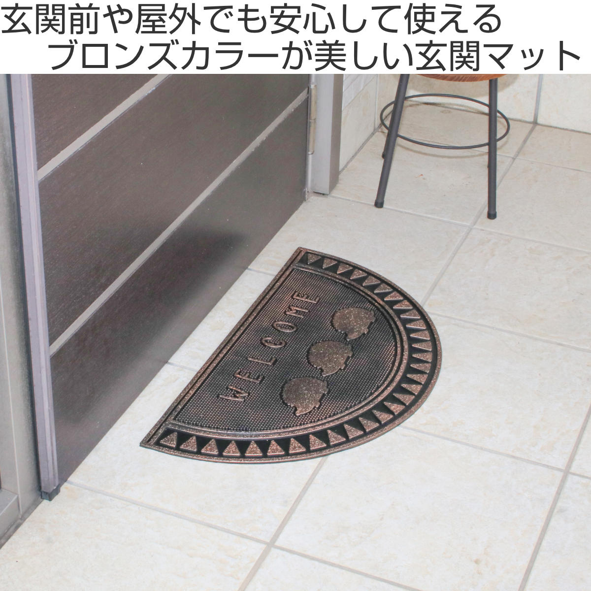 マット全体にゴム素材を使用しているため、地面にしっかりと密着し、ズレにくい仕様です。玄関前や屋外スペースでも安心してご使用いただけます。