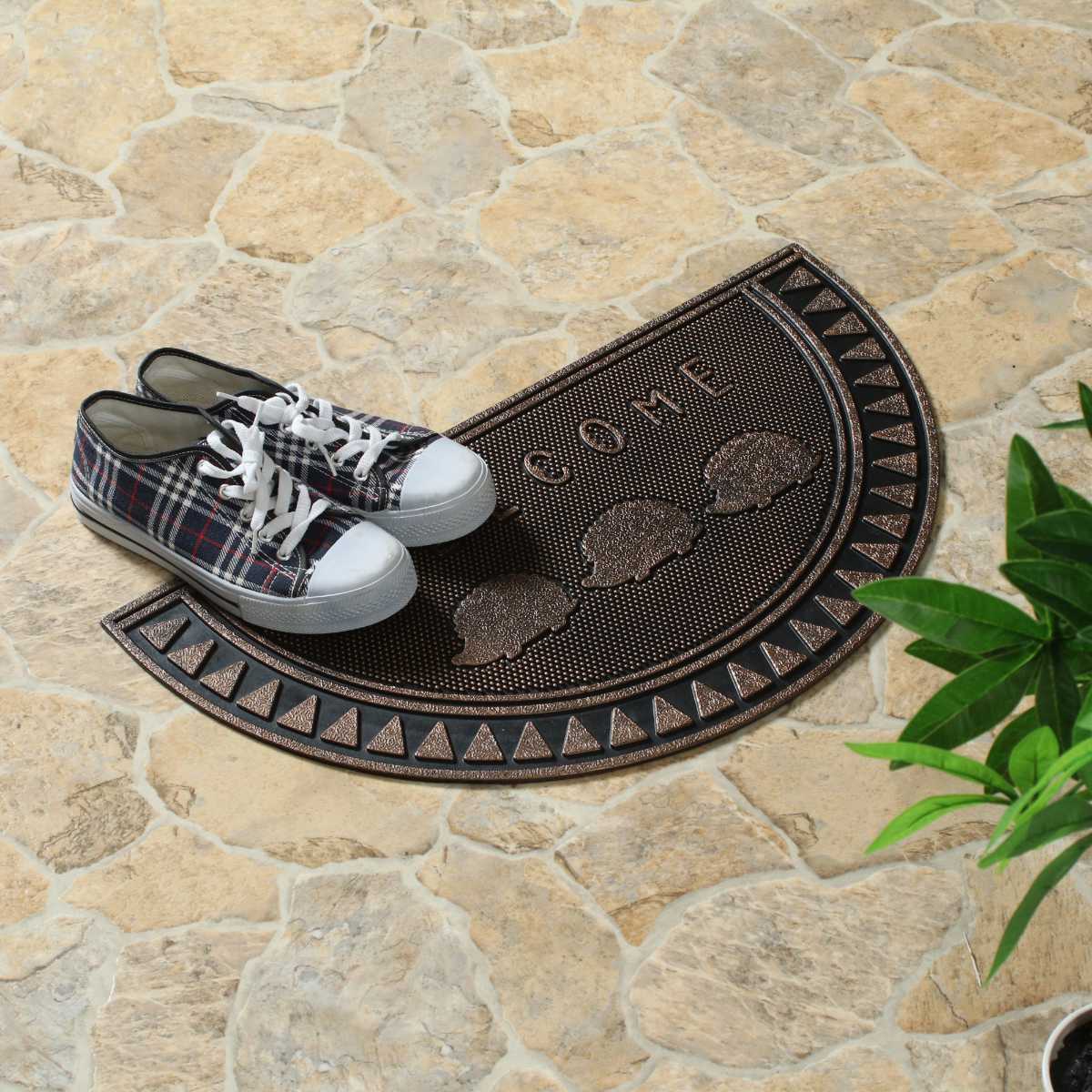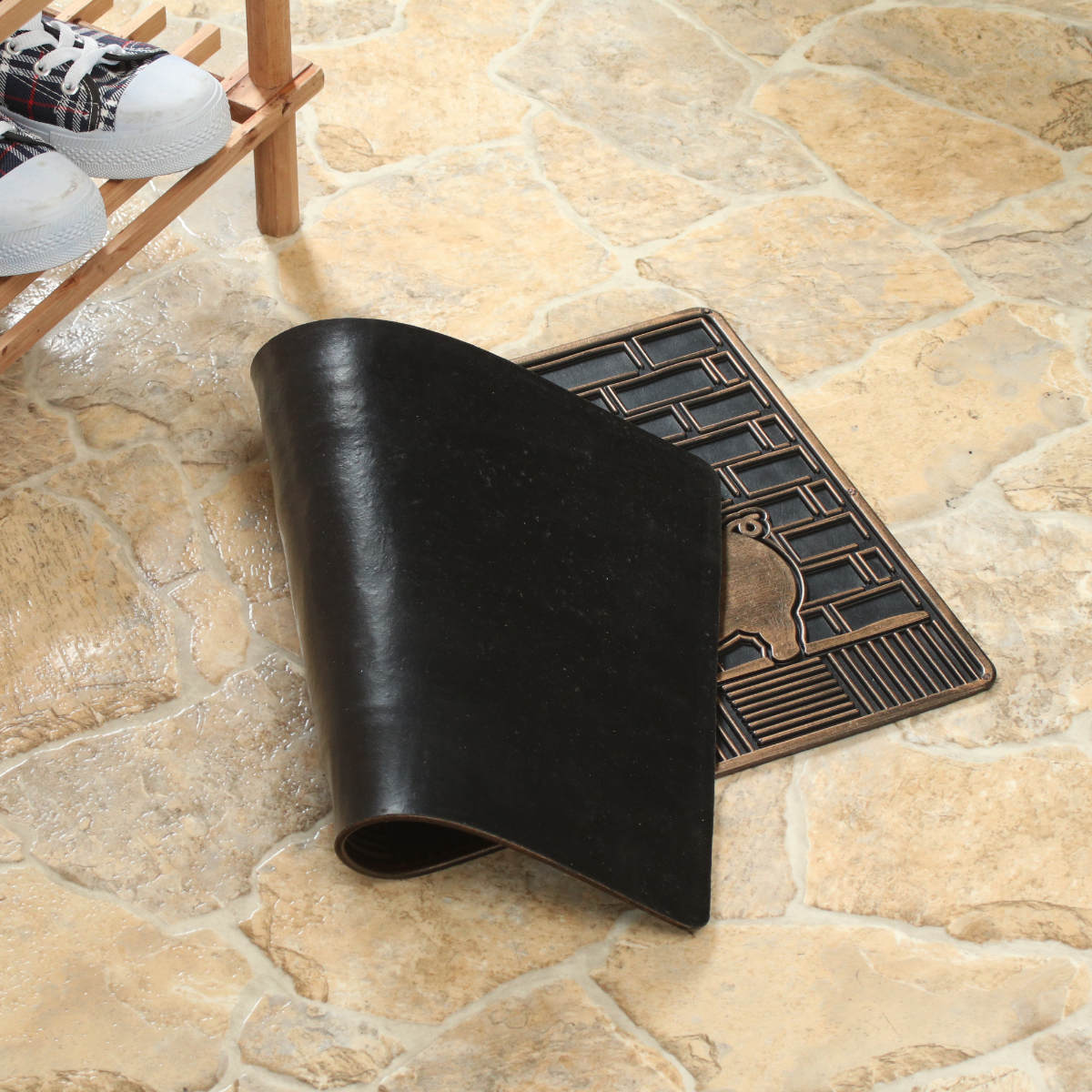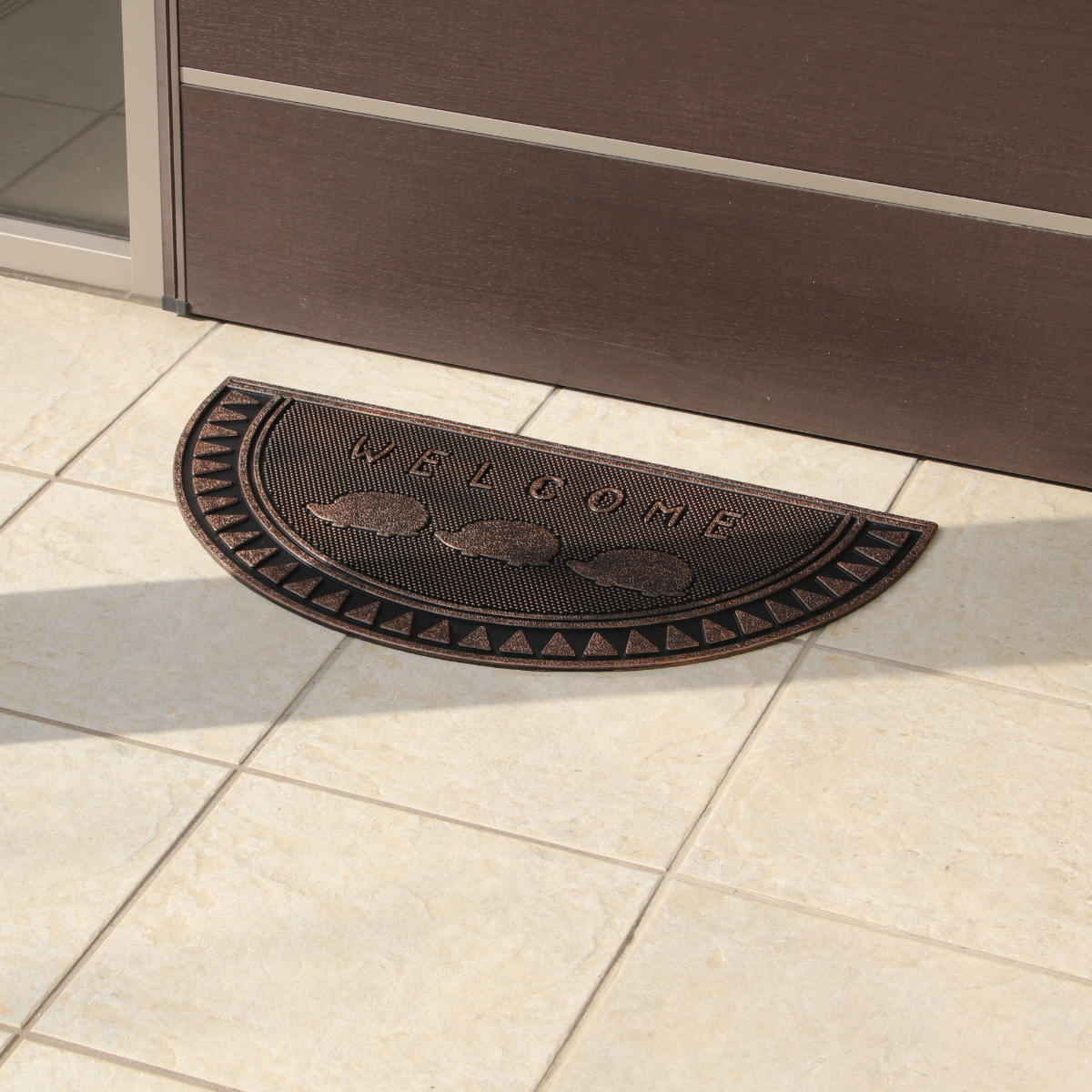 マット全体にゴム素材を使用しているため、地面にしっかりと密着し、ズレにくい仕様です。玄関前や屋外スペースでも安心してご使用いただけます。
