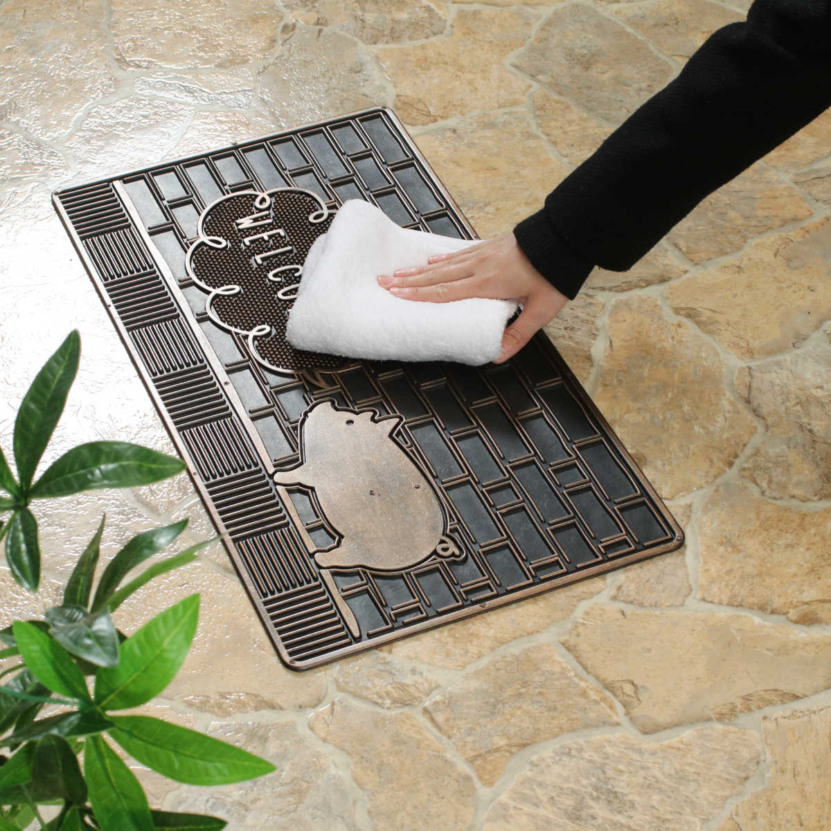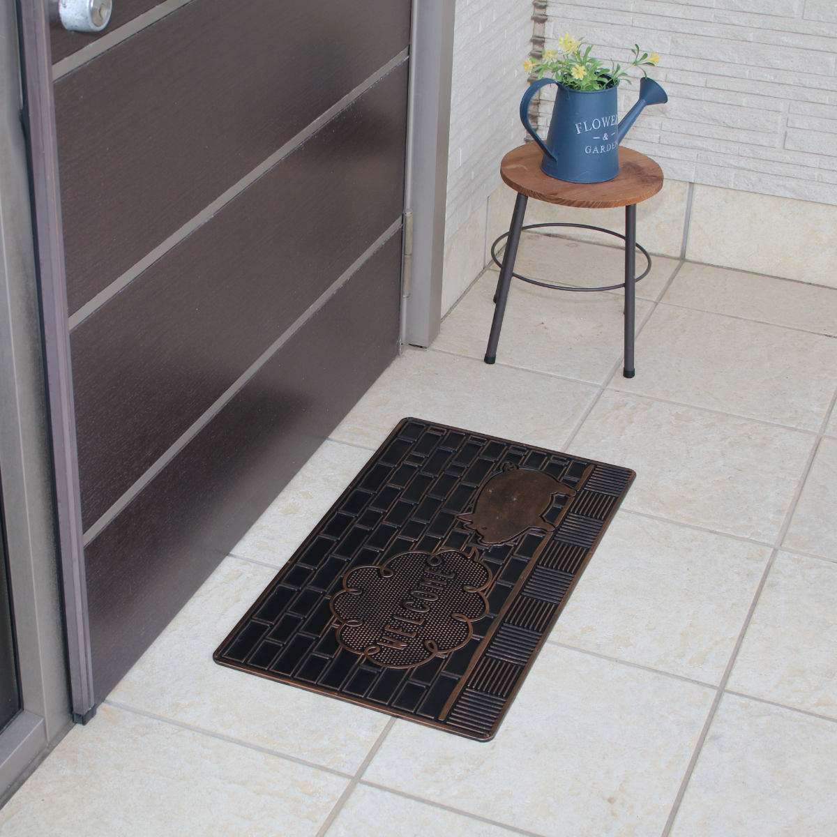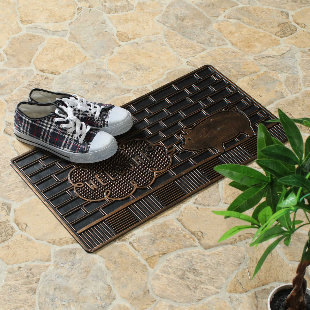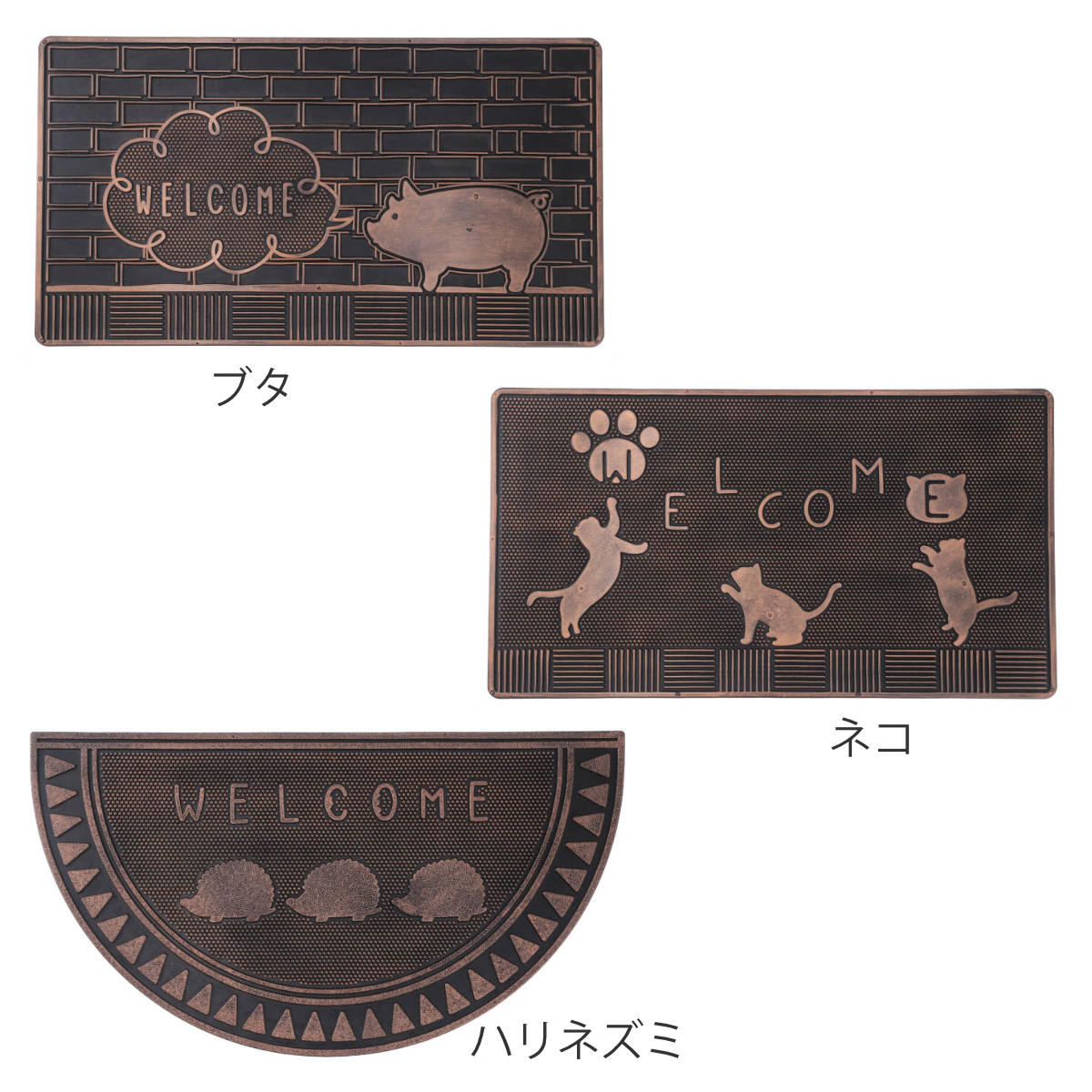 ブロンズカラーの光沢が美しい、少しヴィンテージな雰囲気の玄関マットです。ブタ・ネコ・ハリネズミの3種類のモチーフをご用意しており、玄関に遊び心と個性をプラスします。置くだけで空間の印象が引き締まり、来客時にも目を引くデザインです。