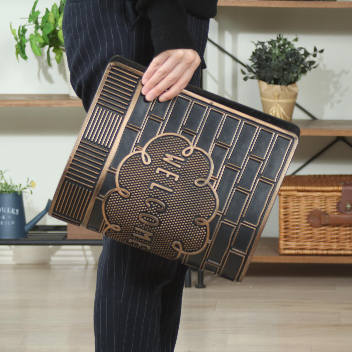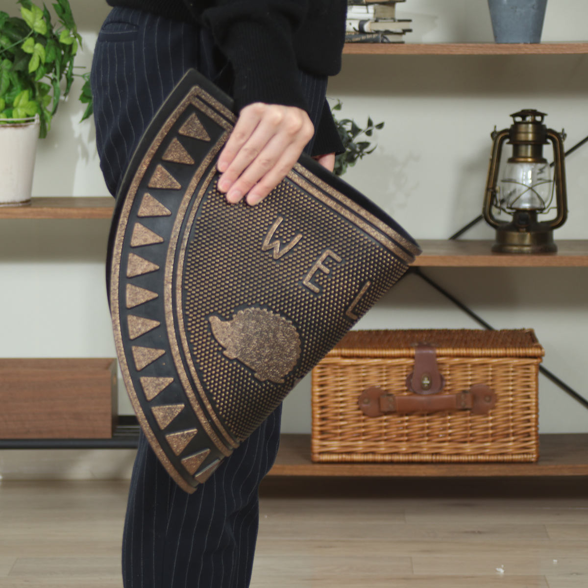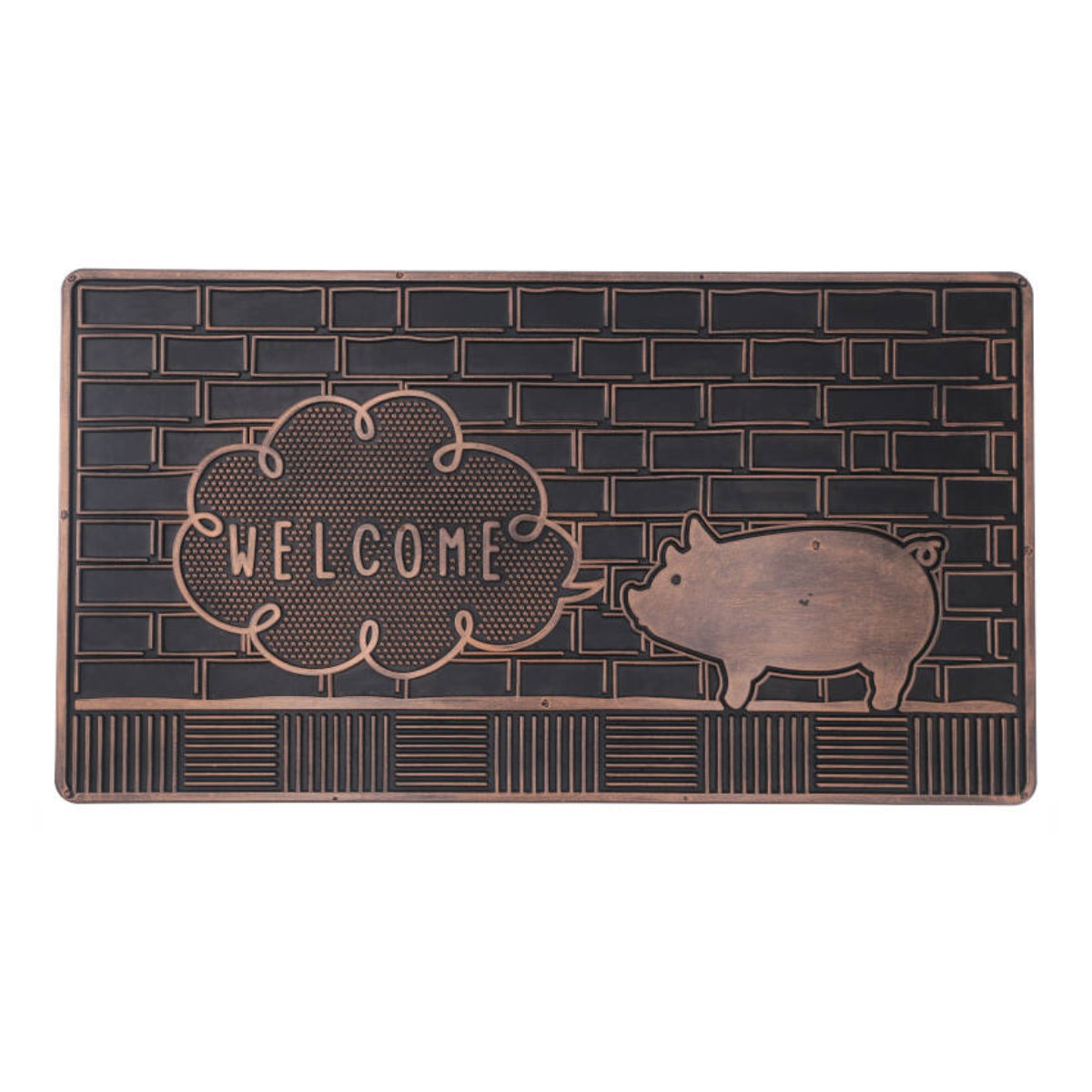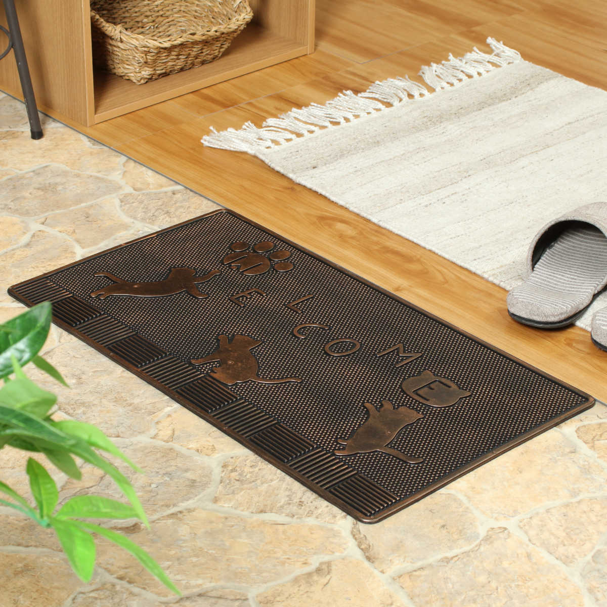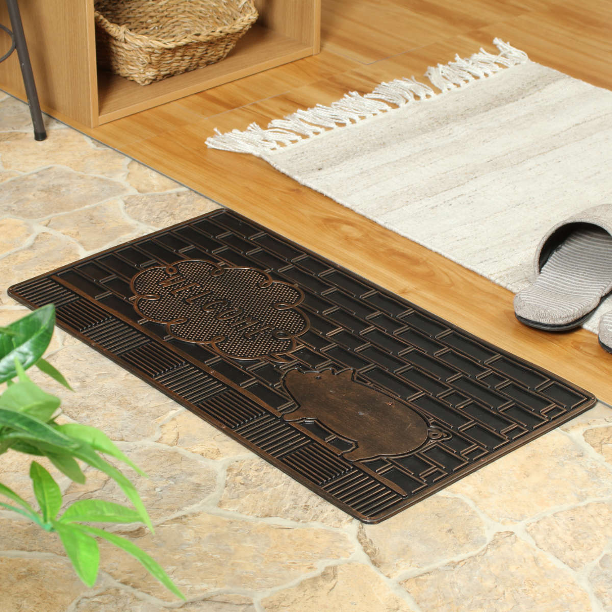 ブロンズカラーの光沢が美しい、少しヴィンテージな雰囲気の玄関マットです。ブタ・ネコ・ハリネズミの3種類のモチーフをご用意しており、玄関に遊び心と個性をプラスします。置くだけで空間の印象が引き締まり、来客時にも目を引くデザインです。