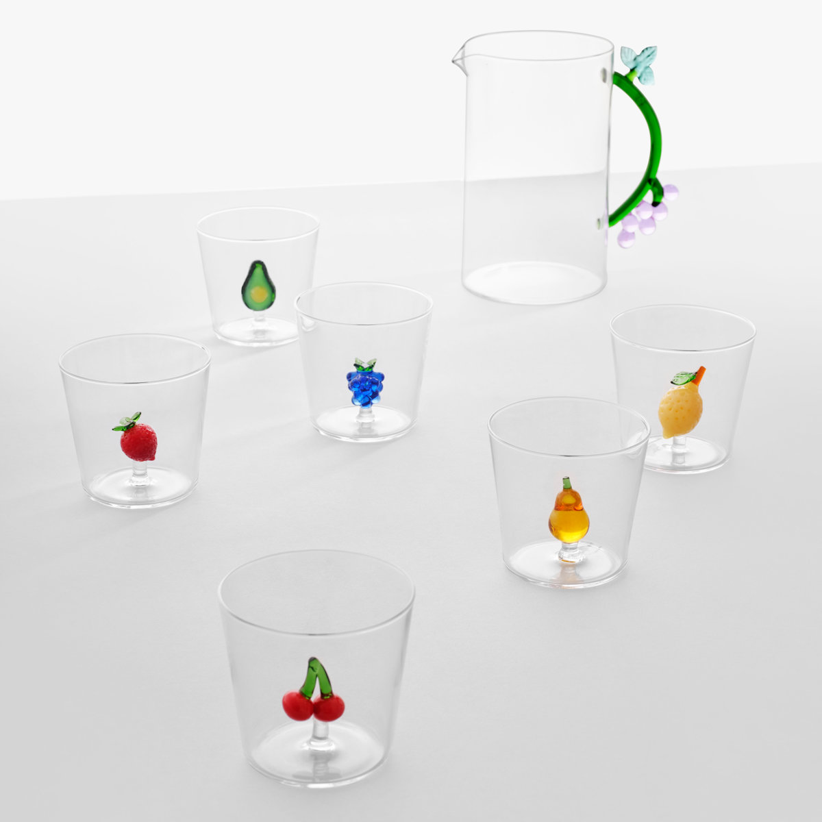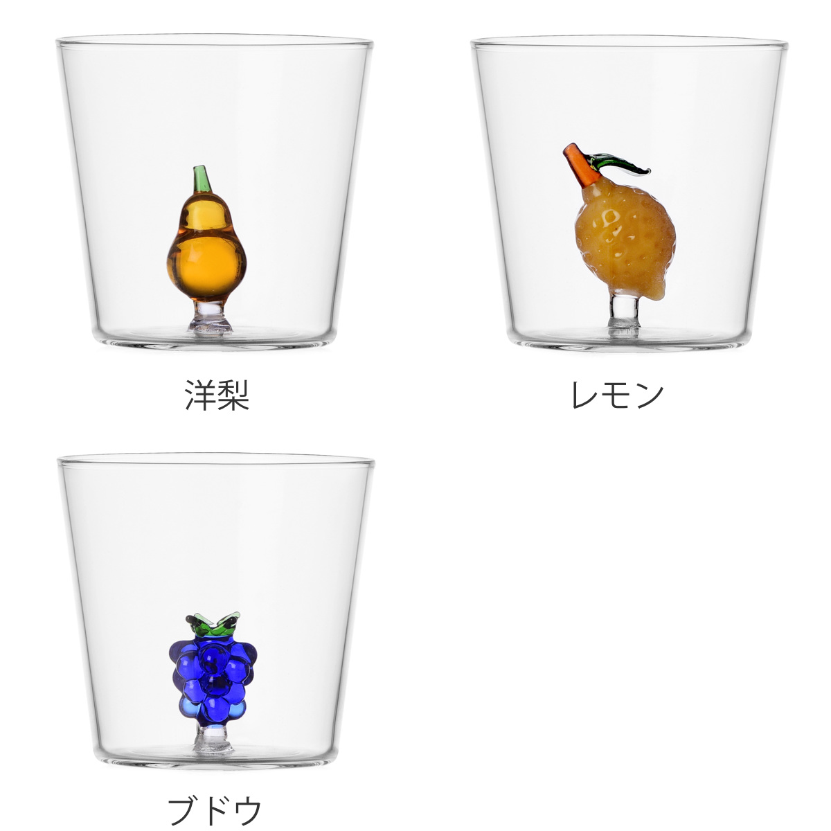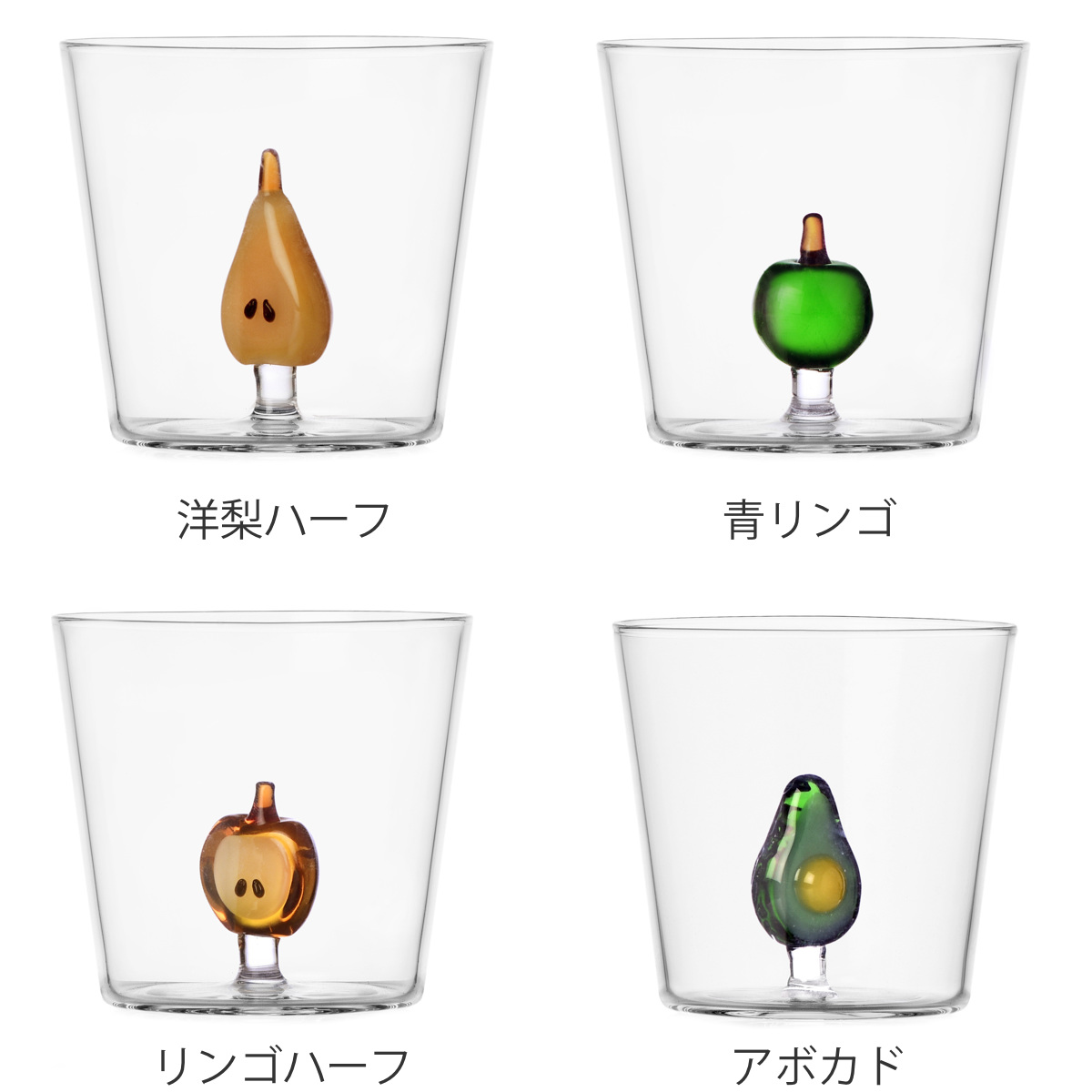 FRUIT&FLOWERSは、ミラノの女性デザイナーアレッサンドラ・バルデレスキによるデザインです。飲み物を注ぐとフルーツがグラスの中で浮かんでいるように見え、テーブルに遊び心を与えます。水やジュース、アイスティーなど幅広い飲み物に使いやすいです。