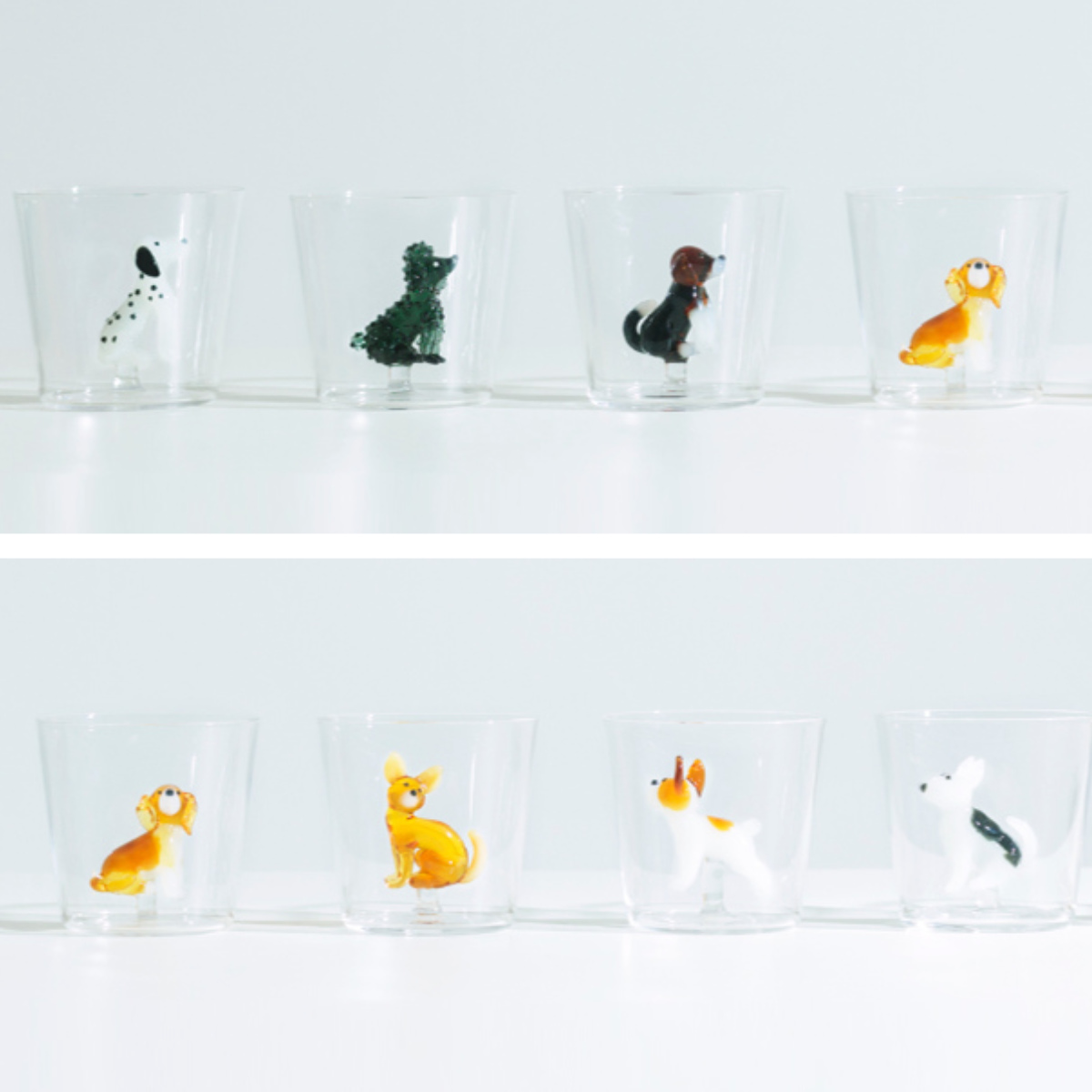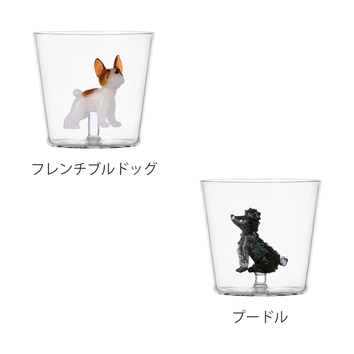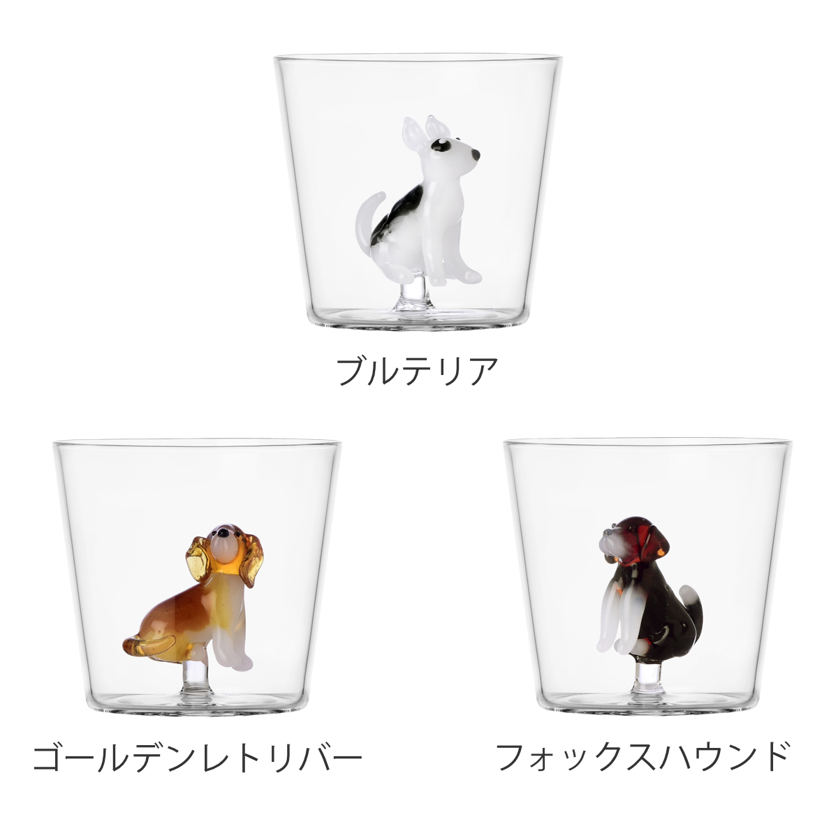 透明度の高い耐熱ガラスを使用しています。タンブラーの中はイヌたちが立体的に表現されています。