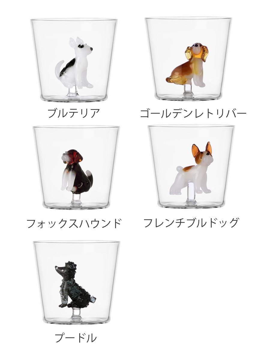 ICHENDORF MILANO(イッケンドルフ ミラノ)、DOGSシリーズのタンブラーです。タンブラーに、ブルテリア、ゴールデンレトリバー、フォックスハウンド、フレンチブルドッグ、プードルがそれぞれ入ったユニークで可愛いデザインです。ガラス職人が一点一点手作業で仕上げています
