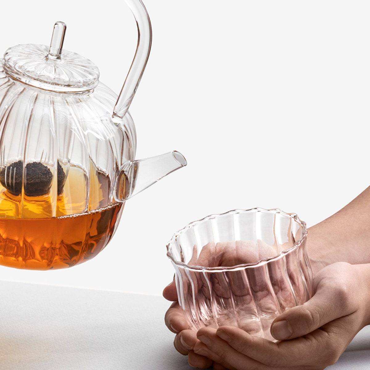 家族や来客時のティータイムにも最適です。透明なガラスで茶葉の開きやお茶の色が見えるので、淹れる時間も楽しめます。手吹きガラスならではの柔らかい風合いと光の反射が、ティータイムを上品に演出します。