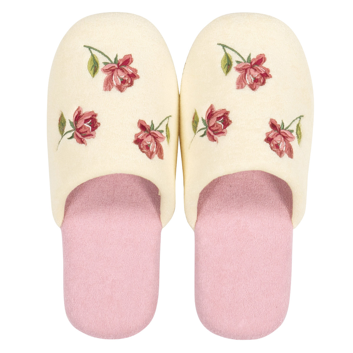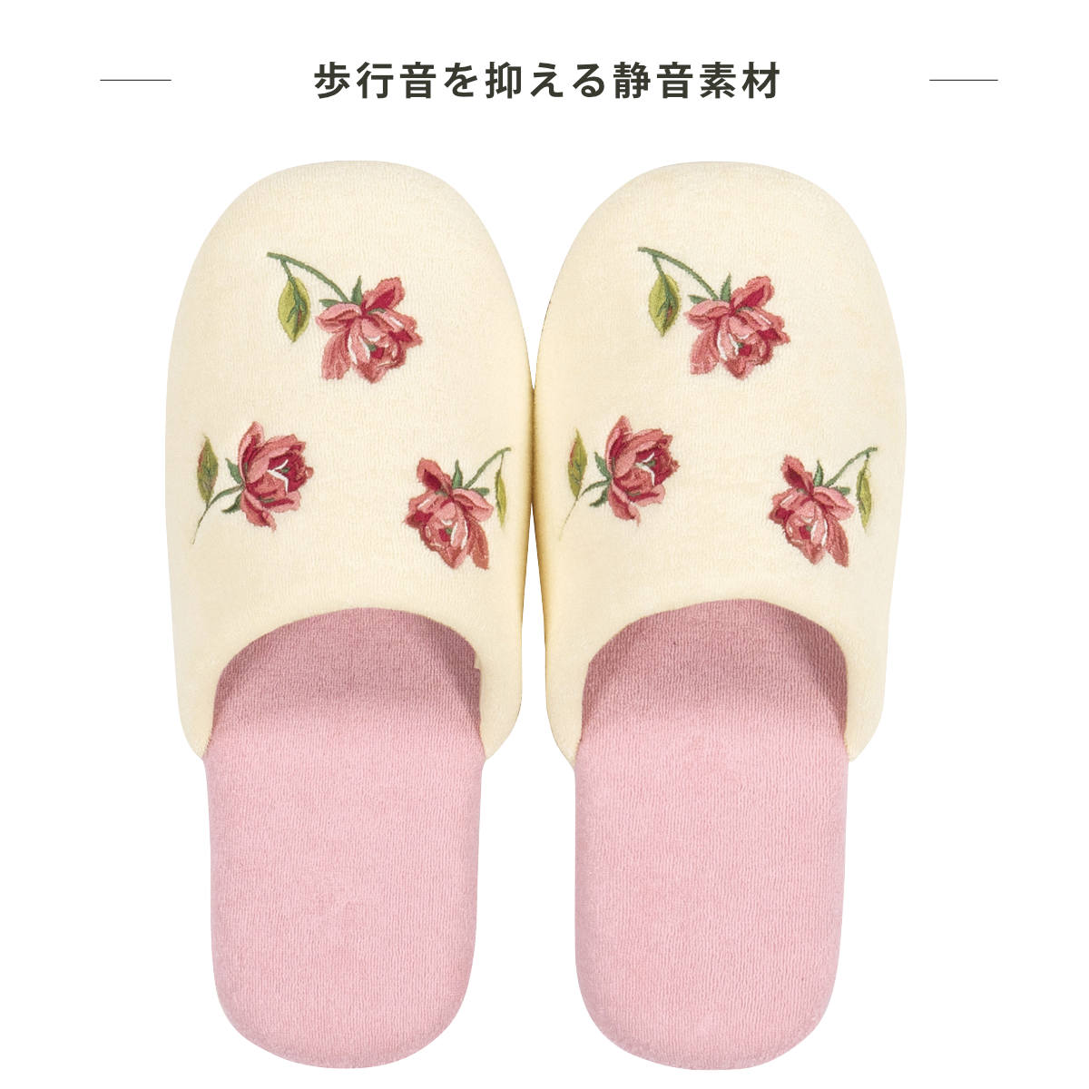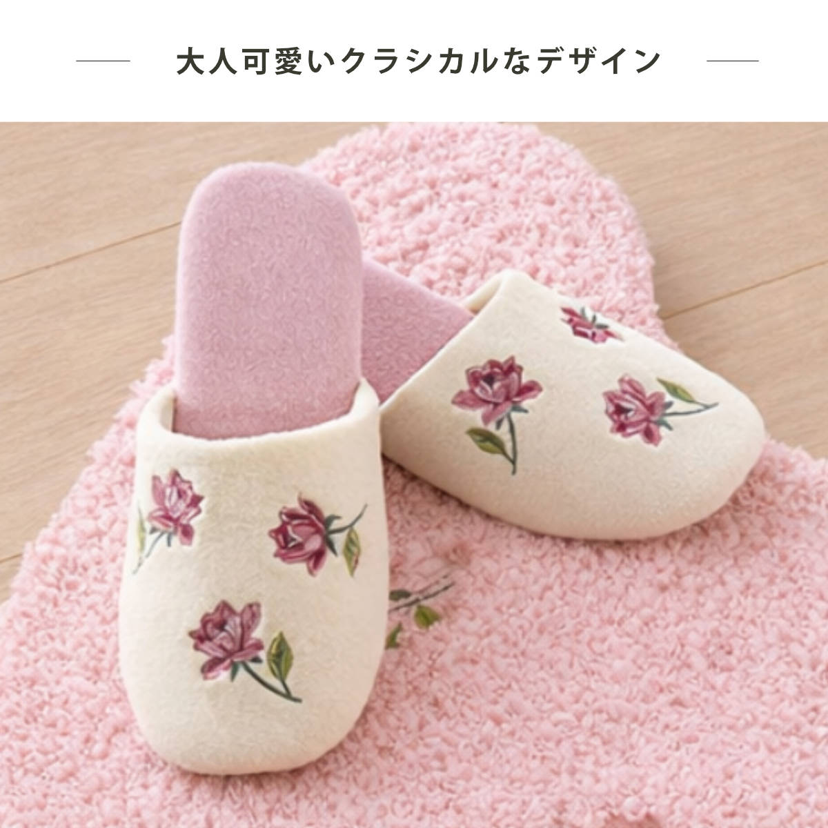 ふんわりと優しいローズピンクのスリッパです。主張しすぎない美しさで日常を華やかに彩ってくれるデザインです。やわらかな履き心地と落ち着いたデザインなので、リビングや寝室などお部屋履きにもおすすめのスリッパです。