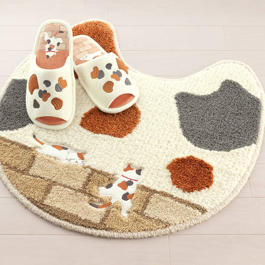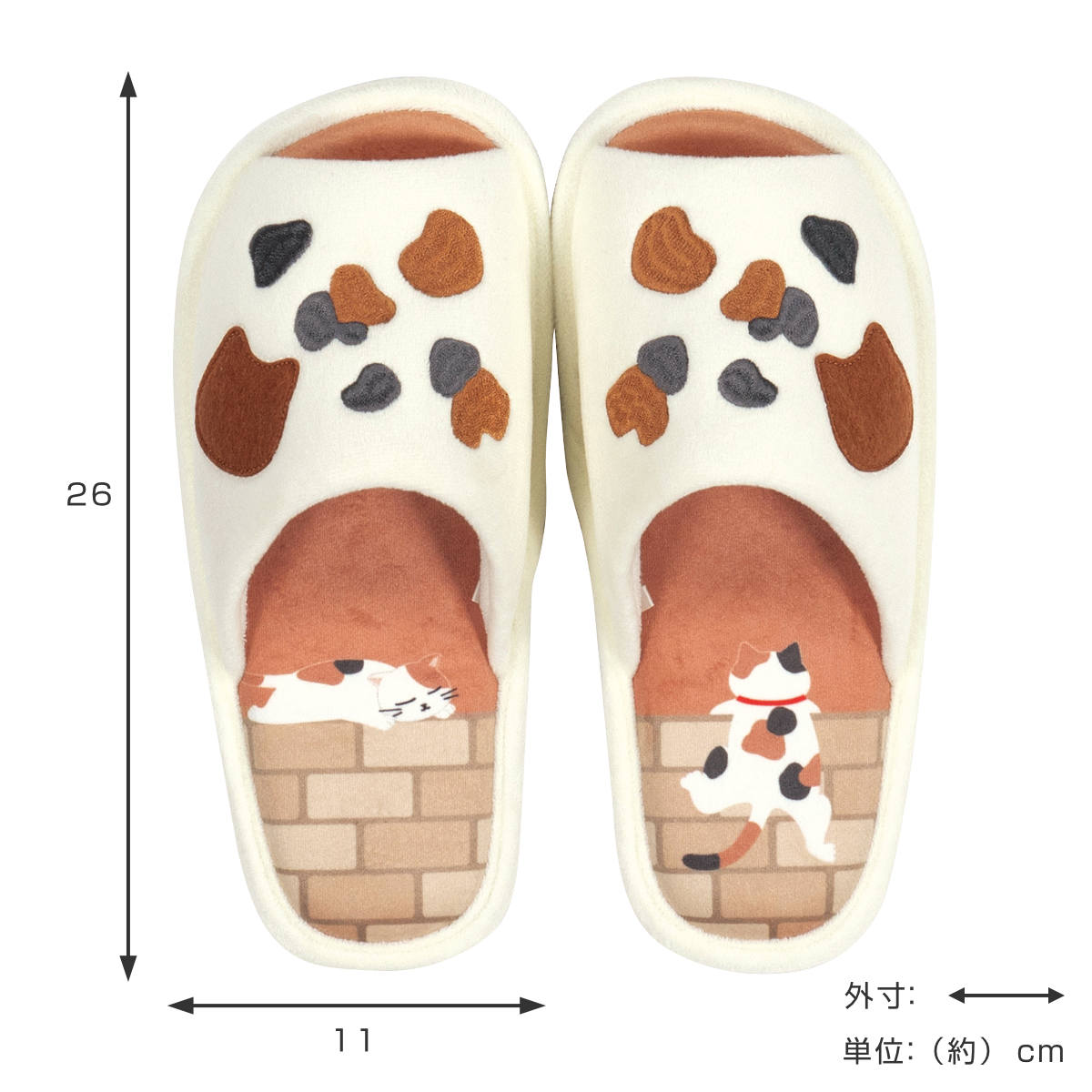 天真爛漫な和にゃんこに癒されるスリッパです。マイペースに過ごすミケ猫たちをアップリケ刺繍で表現した遊び心のある楽しいデザインです。やわらかな履き心地と可愛らしいデザインなので、リビングや寝室などお部屋履きにもおすすめのスリッパです。