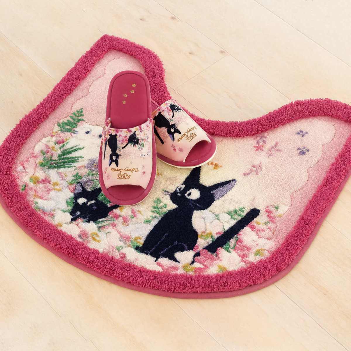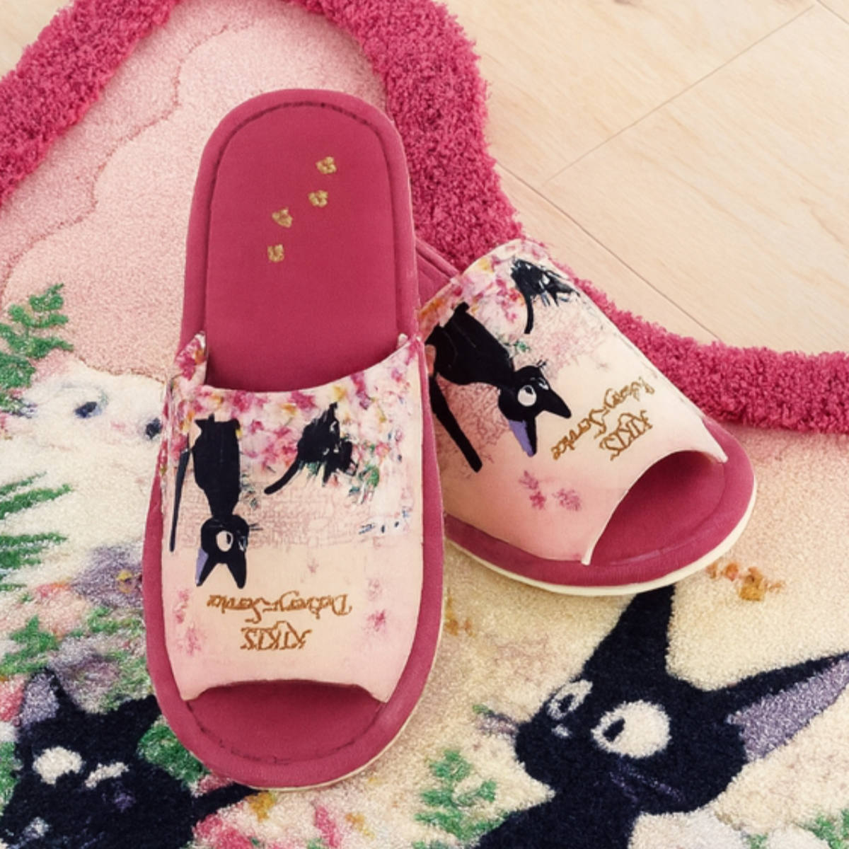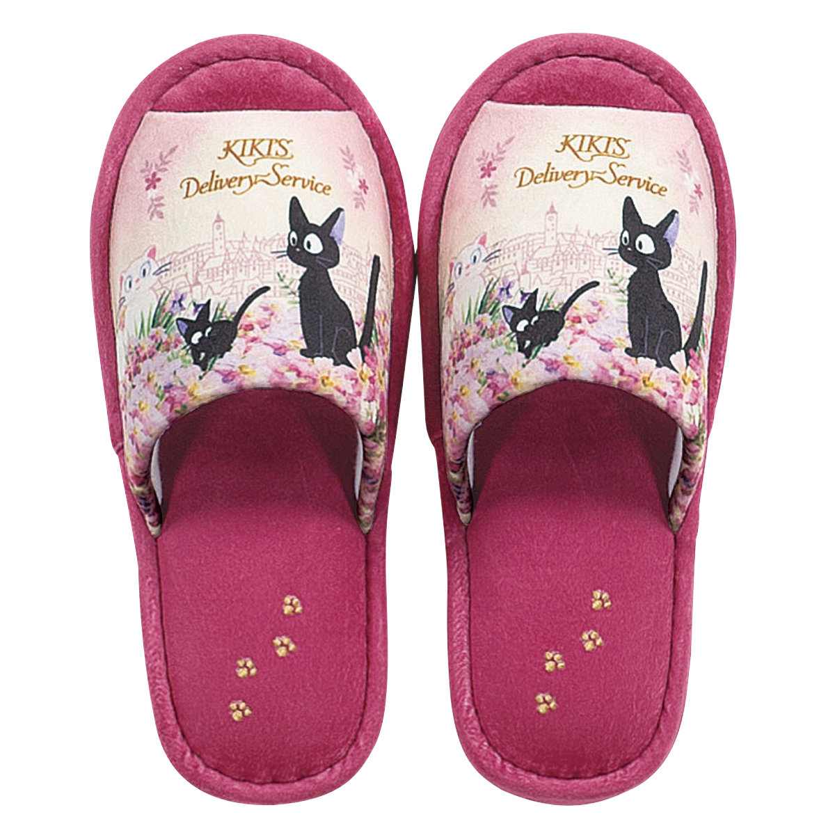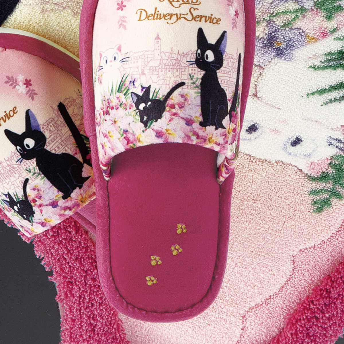 トワイライトの空の下でジジたちが遊んでいるデザインのスリッパです。かかと部分には猫の足跡の刺繍をあしらい、さりげない可愛らしさをプラスしています。