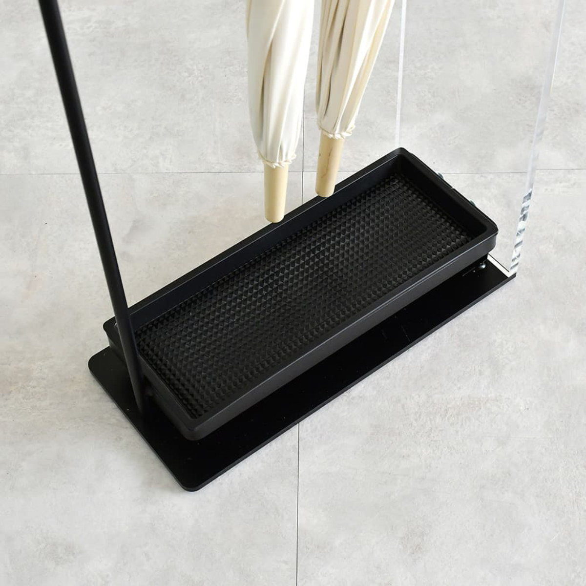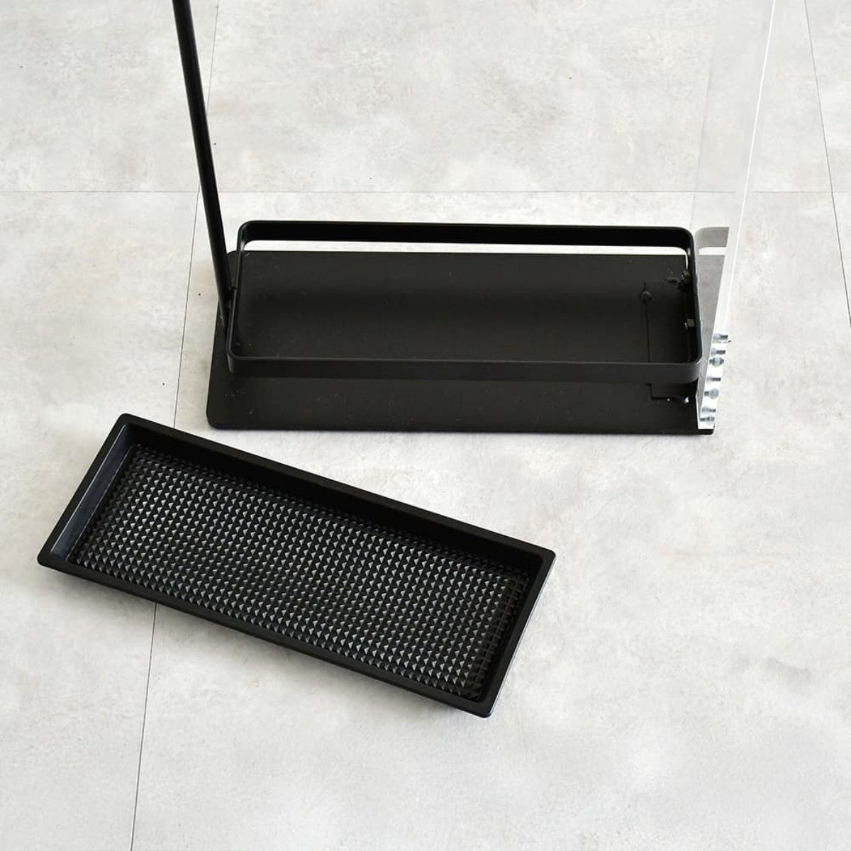 傘の雨滴をしっかり受け止める受け皿は、取り外し可能なトレイ仕様です。水が溜まってもサッと外して洗えるため、お手入れが簡単で、毎日使うアイテムとして清潔に保てます。