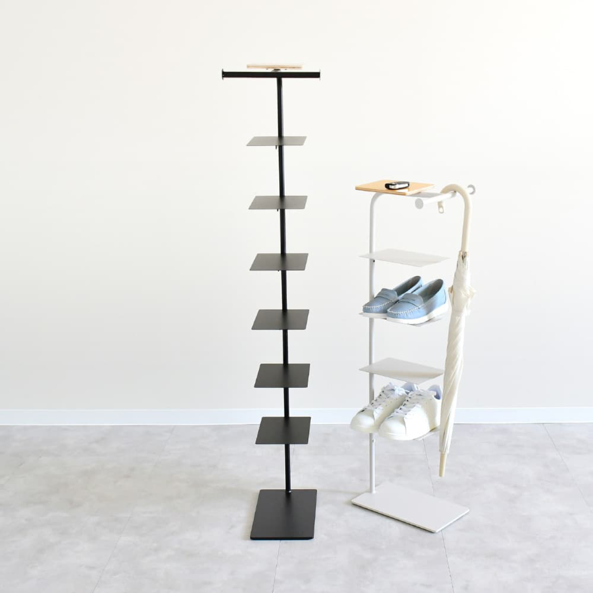 靴が宙に浮かんでいるように見えるスチール棚は、デザイン性だけでなく通気性にも優れています。湿気がこもりにくく、衛生的な収納環境を保てます。棚板は固定式なので、設置後の安定性も高い仕様です。