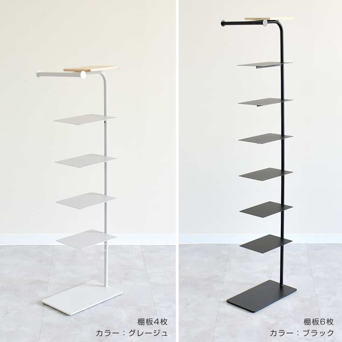 棚板は4枚タイプと6枚タイプの2種類をご用意しています。用途に合わせて選べるのが魅力です。