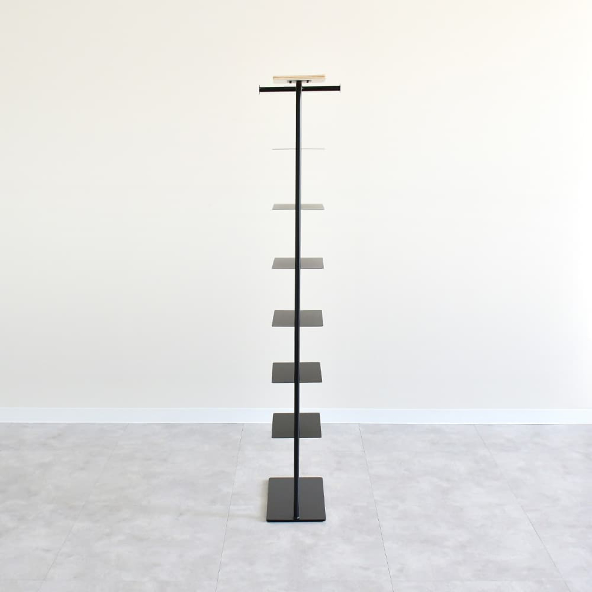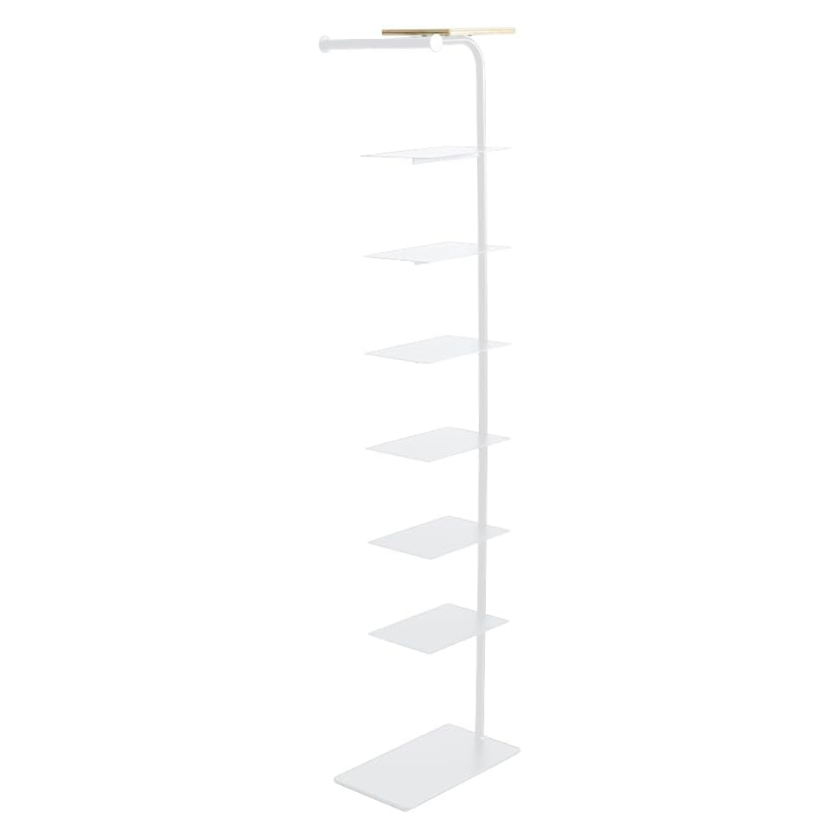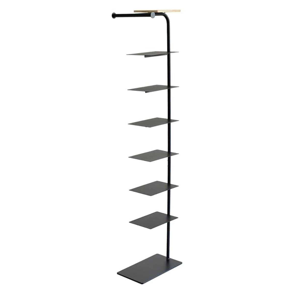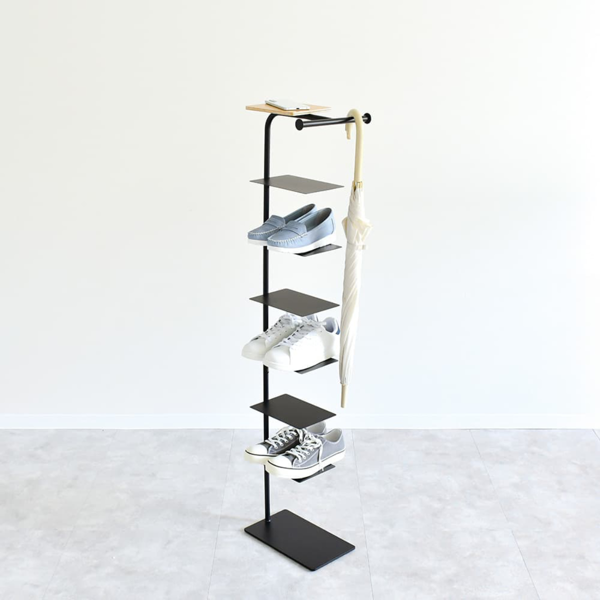 横幅を抑えたスリムなデザインが魅力の、棚6枚タイプのシューズラックです。玄関の限られたスペースにも収まり、最大6段までの棚板に靴をすっきり収納できます。靴を重ねるのではなく、1足ずつディスプレイするように“見せて整える”ことで、空間にリズムが生まれ、暮らしにも整った気持ちをもたらします。上質な木目とマットなスチールが、玄関空間に調和と洗練をプラスします。