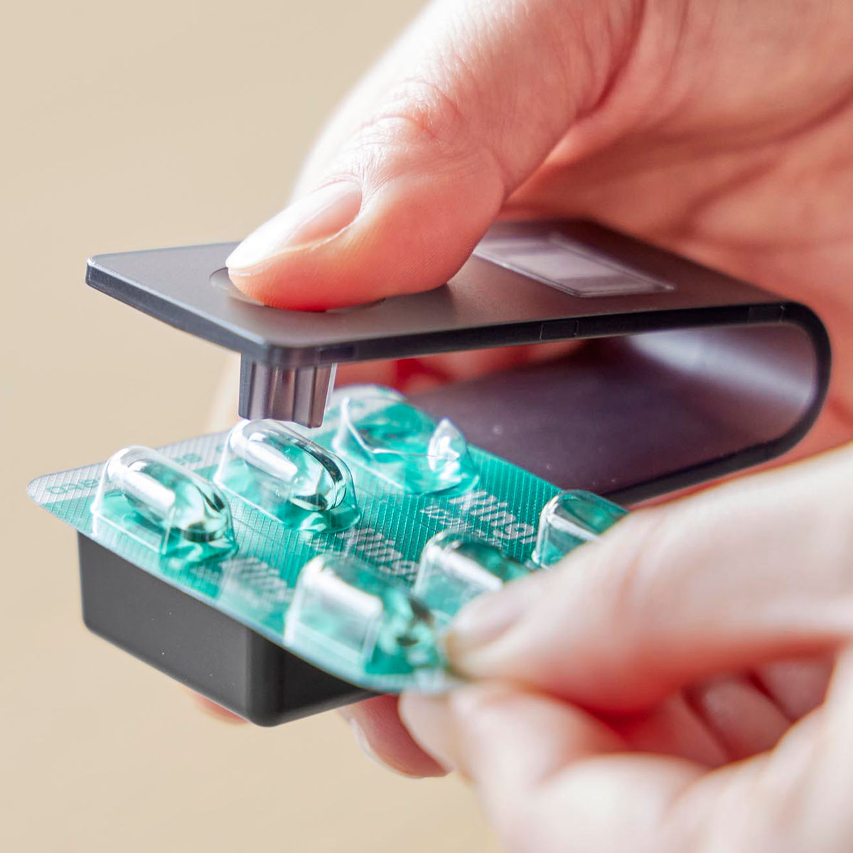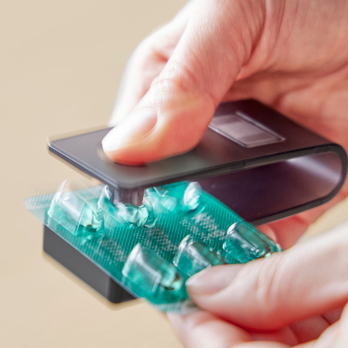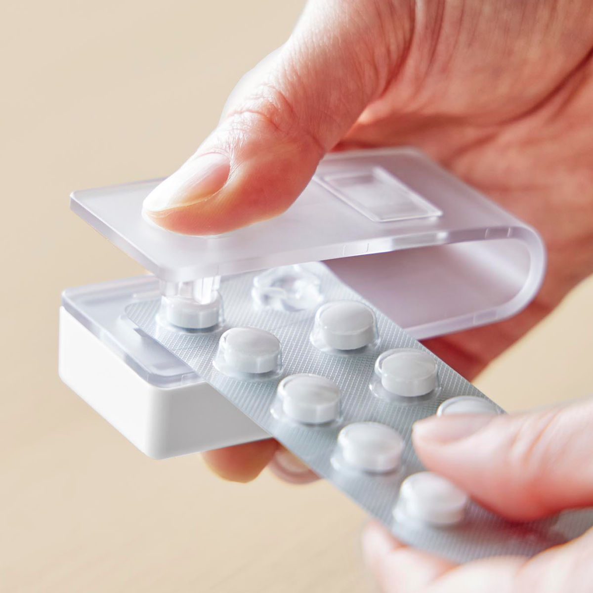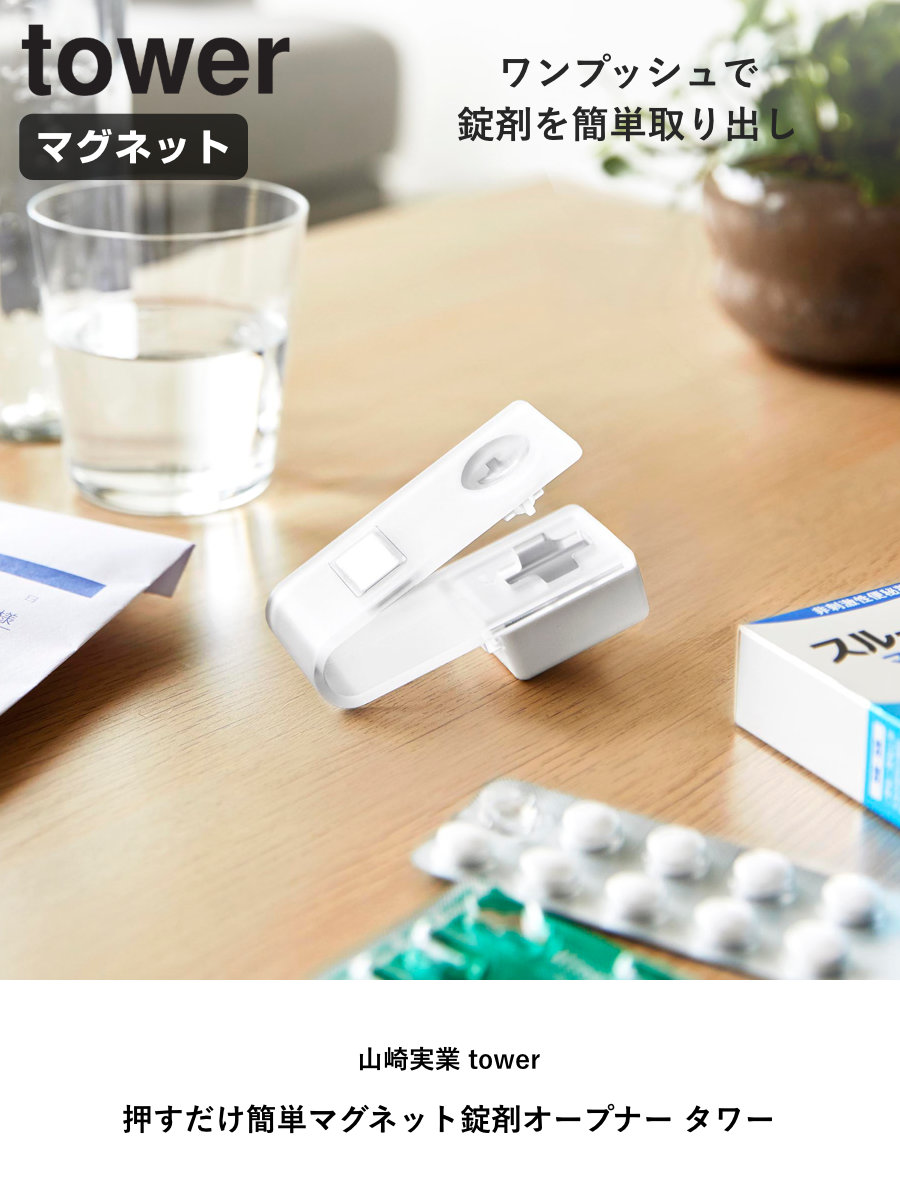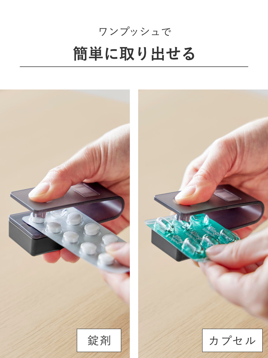 ワンプッシュで簡単に錠剤を取り出せる、マグネット収納対応の錠剤オープナーです。錠剤にもカプセルにも対応しています。