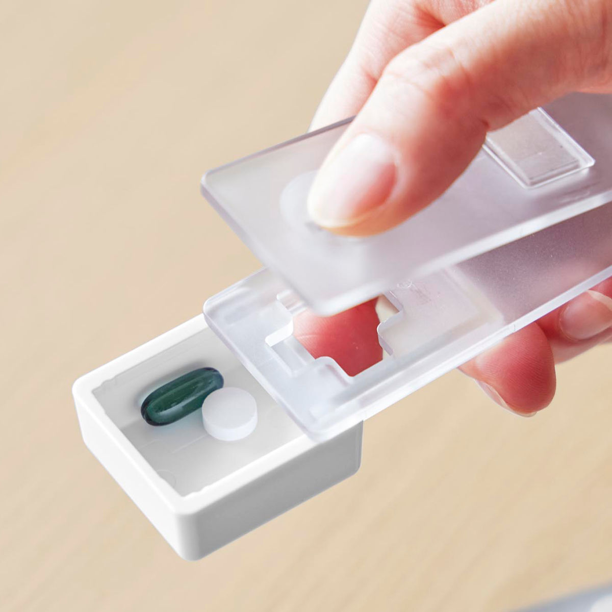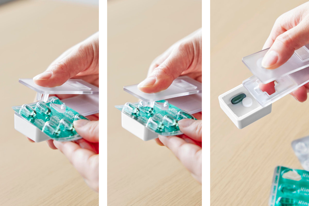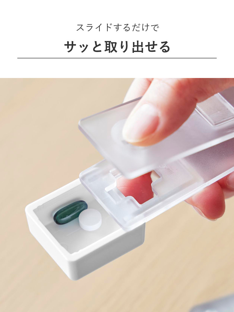 錠剤は受け皿に溜まるので取り出しやすく、スライドするだけでサッと取り出せます。個数や種類が一目でわかり、飲み忘れ防止にも役立ちます。