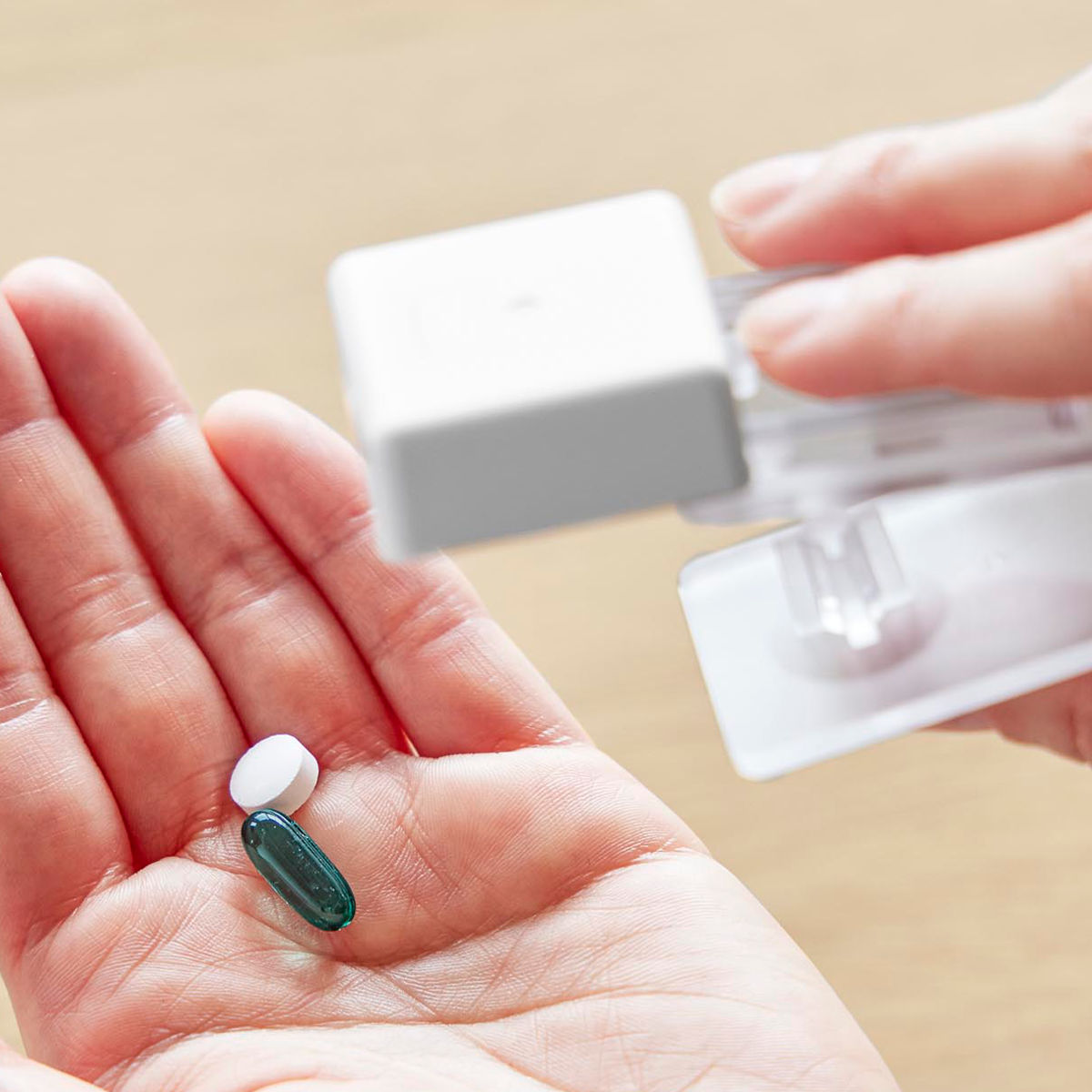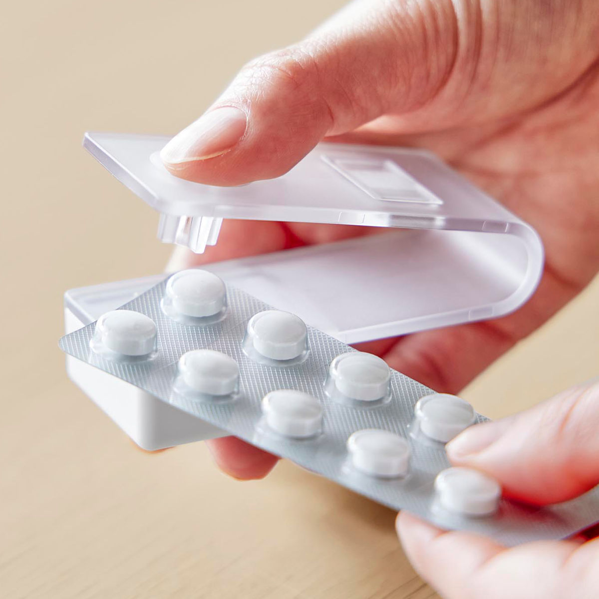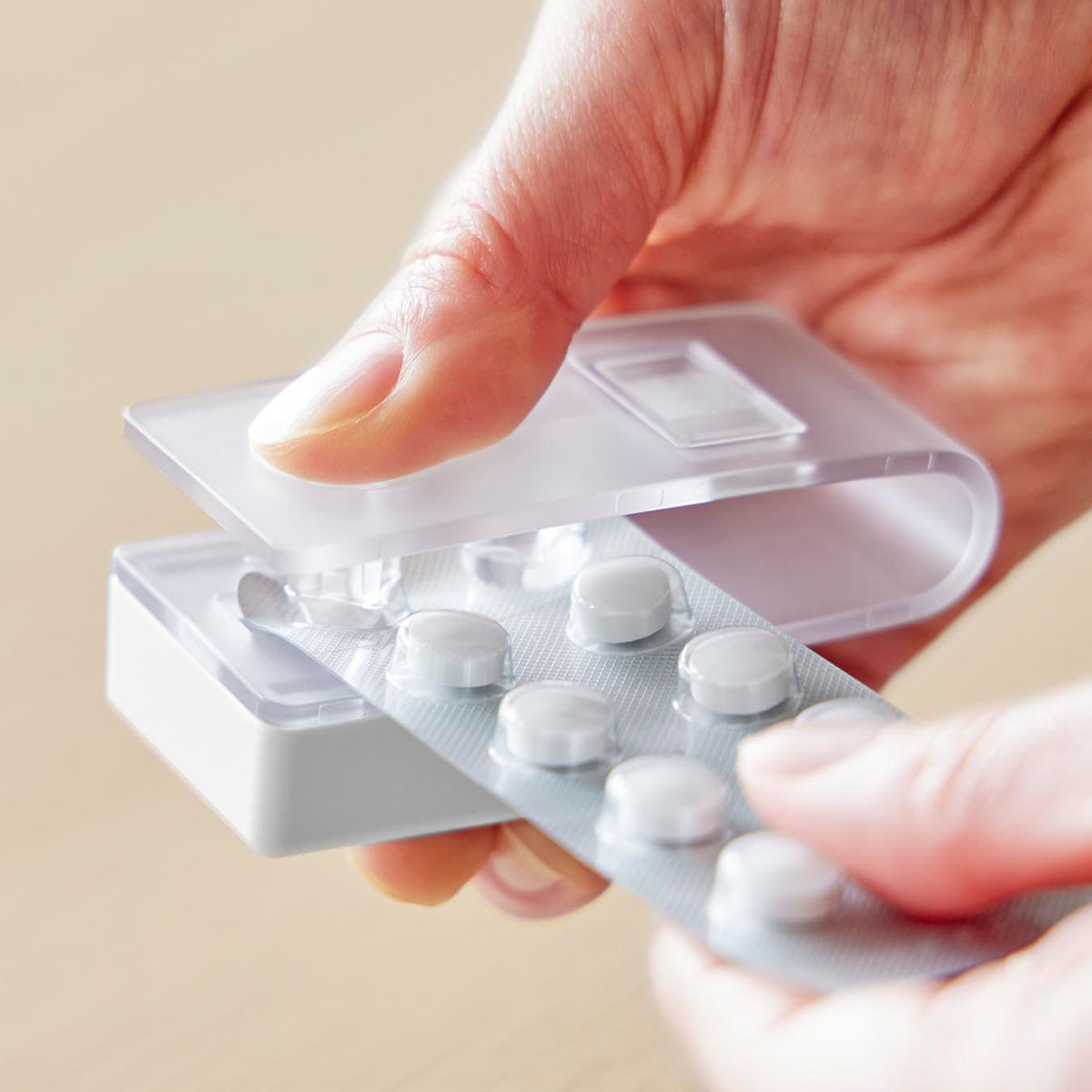 錠剤は受け皿に溜まるので取り出しやすく、スライドするだけでサッと取り出せます。個数や種類が一目でわかり、飲み忘れ防止にも役立ちます。
