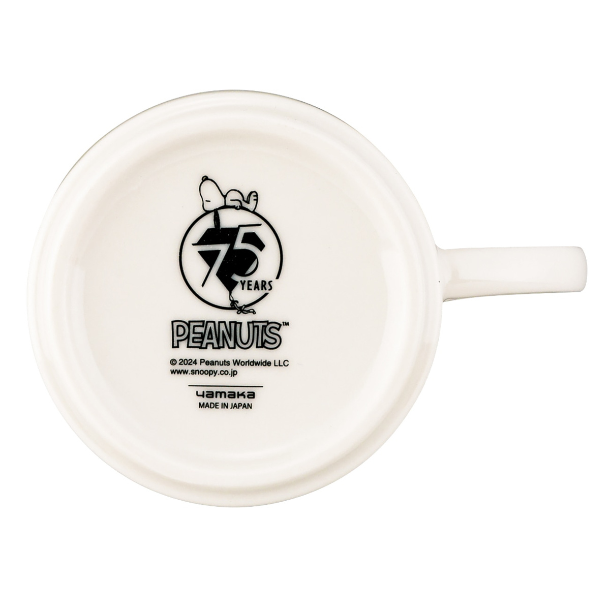 PEANUTS誕生75周年を記念した特別デザインのマグカップです。磁器製で丈夫なつくりのため、毎日の食卓で安心してお使いいただけます。350mlのたっぷりサイズで、コーヒーや紅茶、スープにもぴったりです。普段使いはもちろん、スヌーピー好きの方へのギフトにもおすすめです。
