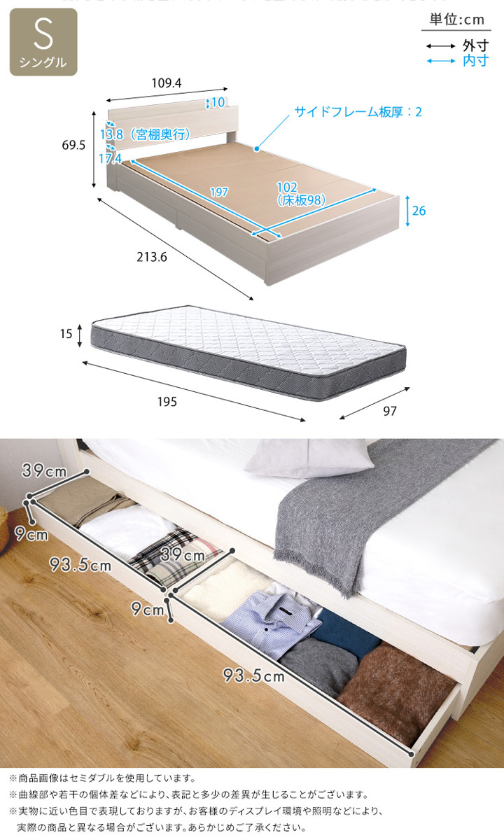 | サイズ | ベッド:約幅109.4×奥行213.6×高さ69.5cm マットレス:約幅97×奥行195×高さ15cm |