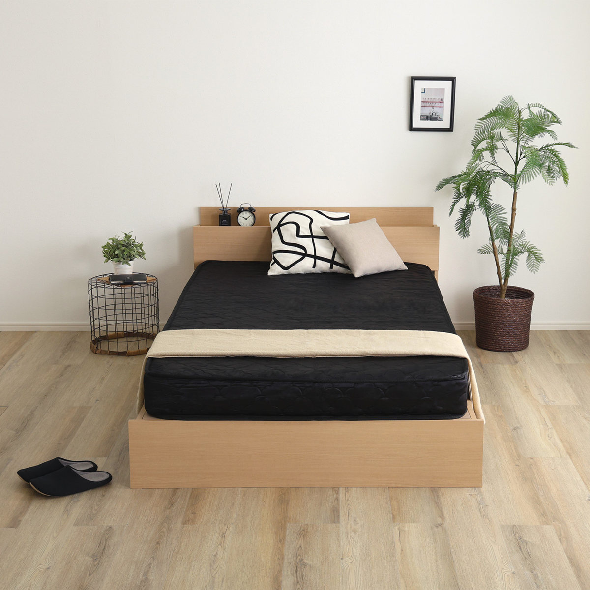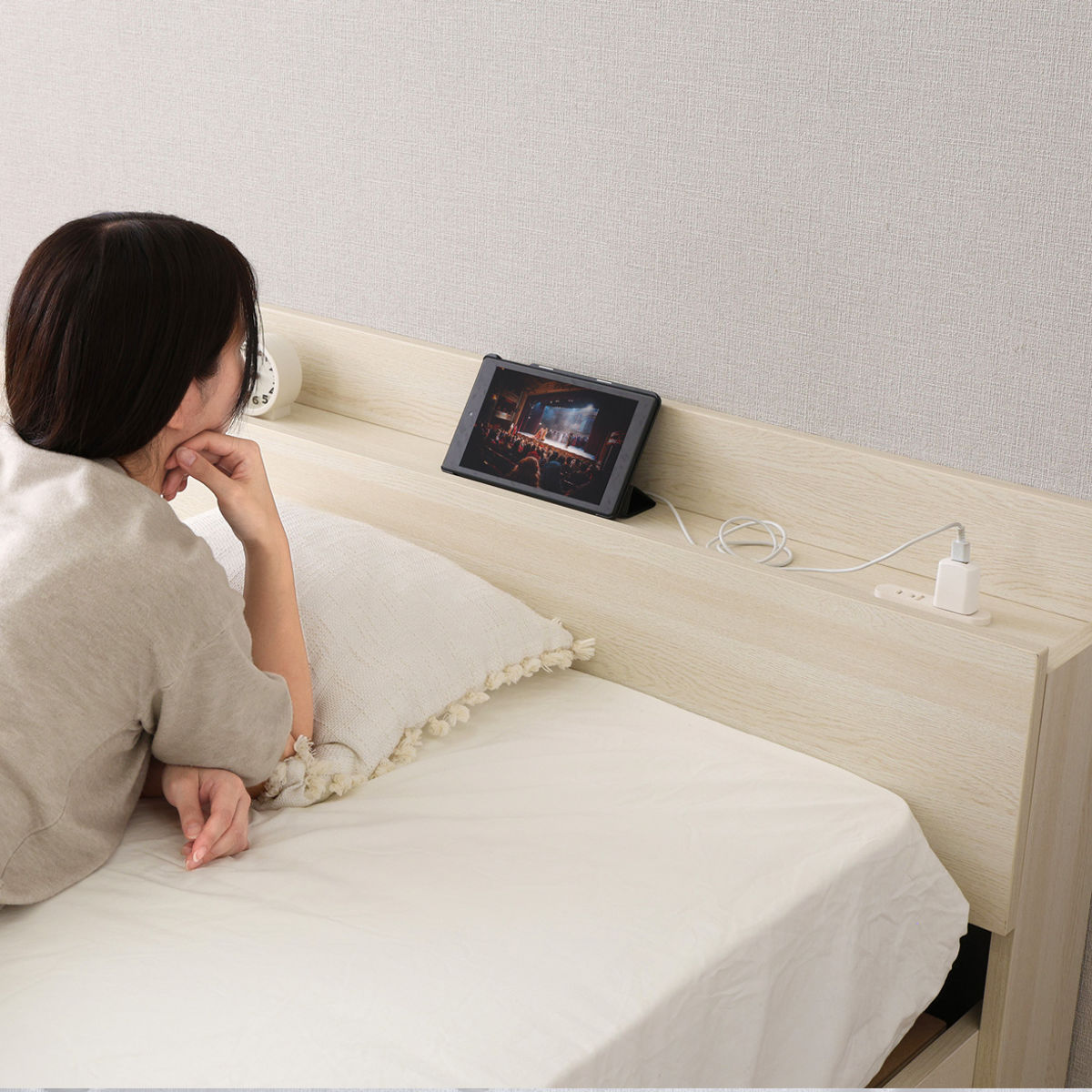 ヘッドボードには便利な2口コンセントが付いています。スマートフォンやタブレットの充電はもちろん、時計や小物を置ける宮棚としても活躍します。タブレットを立てかけて使える形状で、ベッド時間をより快適にサポートします。