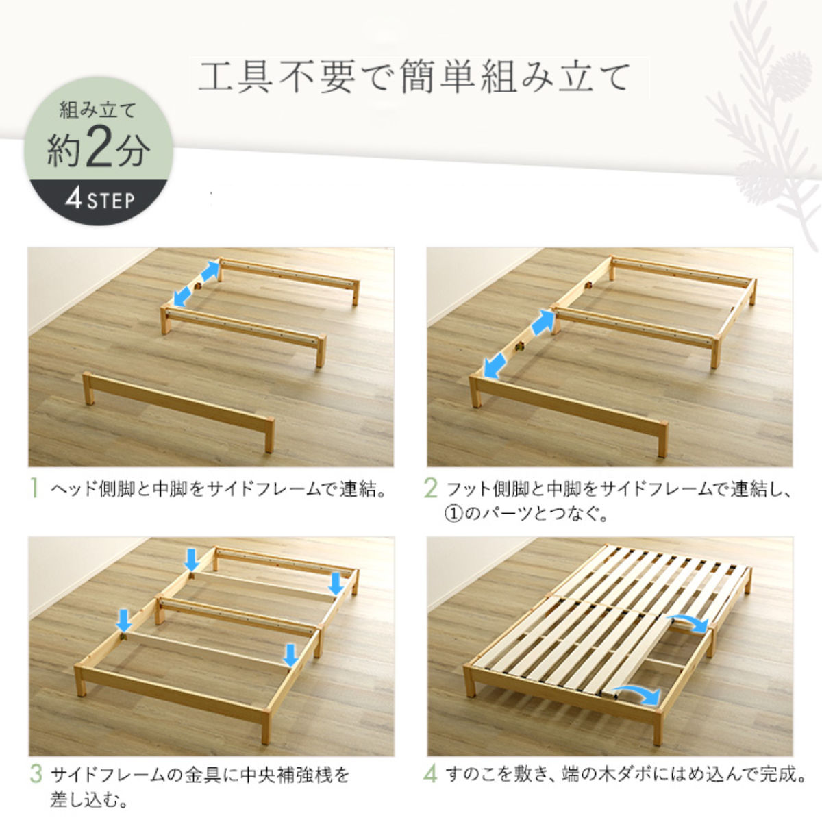 工具やネジを使わず、フレームを差し込み、すのこを木ダボにはめるだけの簡単設計です。約2分で組み立てが完了し、届いたその日からすぐにお使いいただけます。素材には天然木パイン材を使用し、木の風合いとやさしい温もりを感じられる仕上がりです。