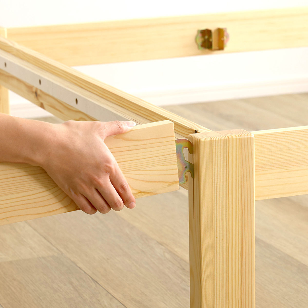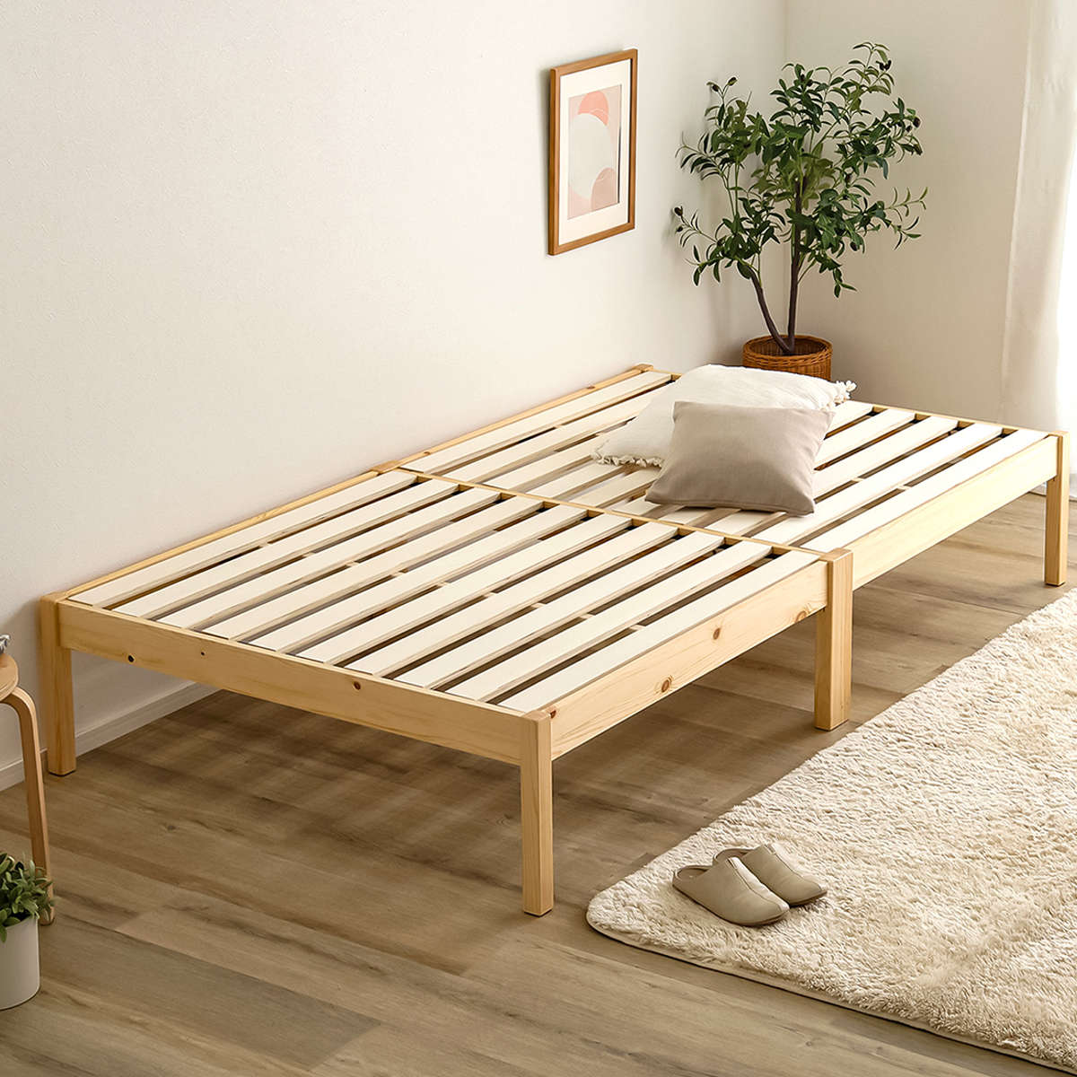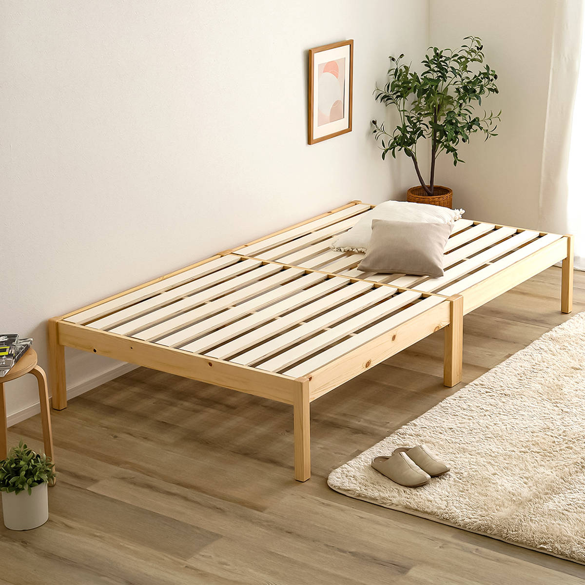 工具やネジを使わず、フレームを差し込み、すのこを木ダボにはめるだけの簡単設計です。約2分で組み立てが完了し、届いたその日からすぐにお使いいただけます。素材には天然木パイン材を使用し、木の風合いとやさしい温もりを感じられる仕上がりです。