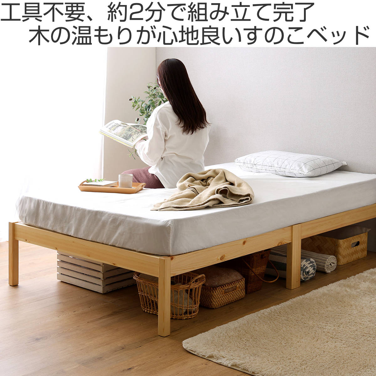 工具やネジを使わず、フレームを差し込み、すのこを木ダボにはめるだけの簡単設計です。約2分で組み立てが完了し、届いたその日からすぐにお使いいただけます。素材には天然木パイン材を使用し、木の風合いとやさしい温もりを感じられる仕上がりです。