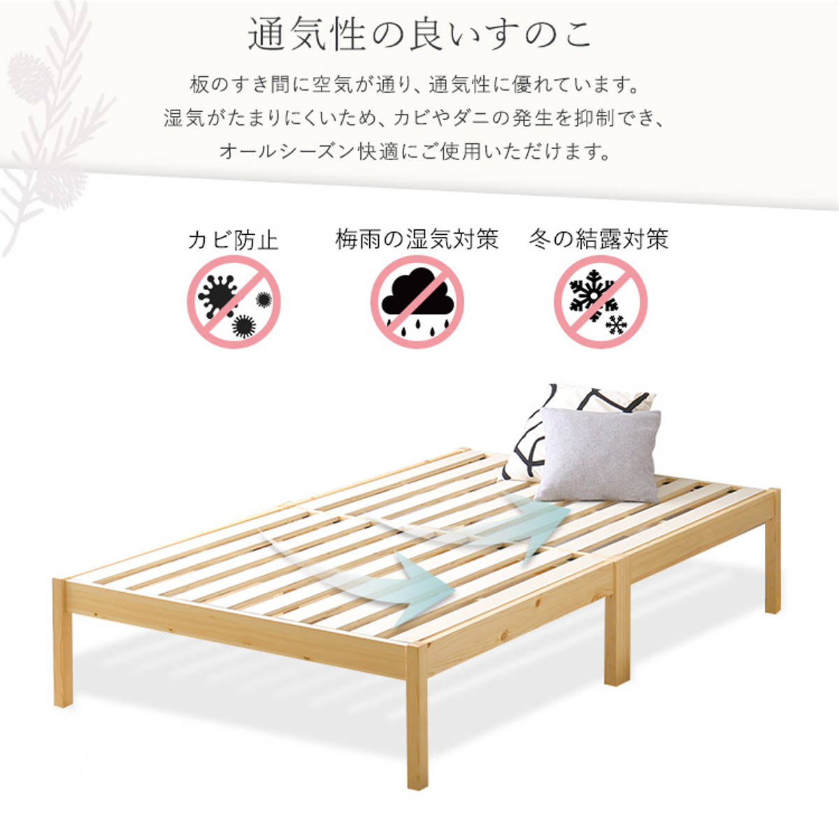 床面には、板のすき間に風が通り、通気性に優れているすのこを使用しています。湿気がたまりにくいため、カビやダニの発生を抑制でき、オールシーズン快適にお使いいいただけます。