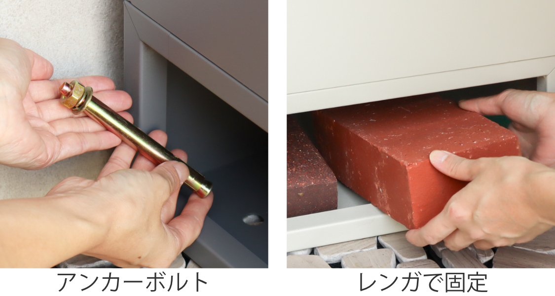 台座部は、付属のアンカーボルトでの固定か、台座部にレンガを置き、重しとして固定するかのいずれかになります。