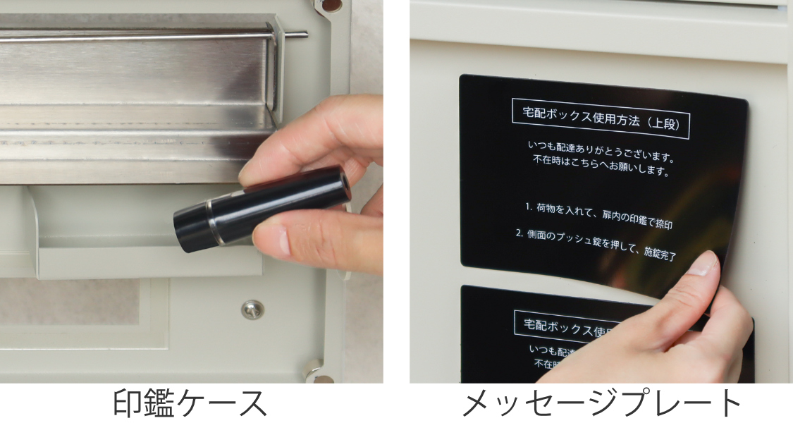 宅配業者用の配達マニュアルが記載されたメッセージプレートと、キーフック付印鑑ケースが付属しています。印鑑ケースは2個付属しており、上下各段に取り付け可能です。