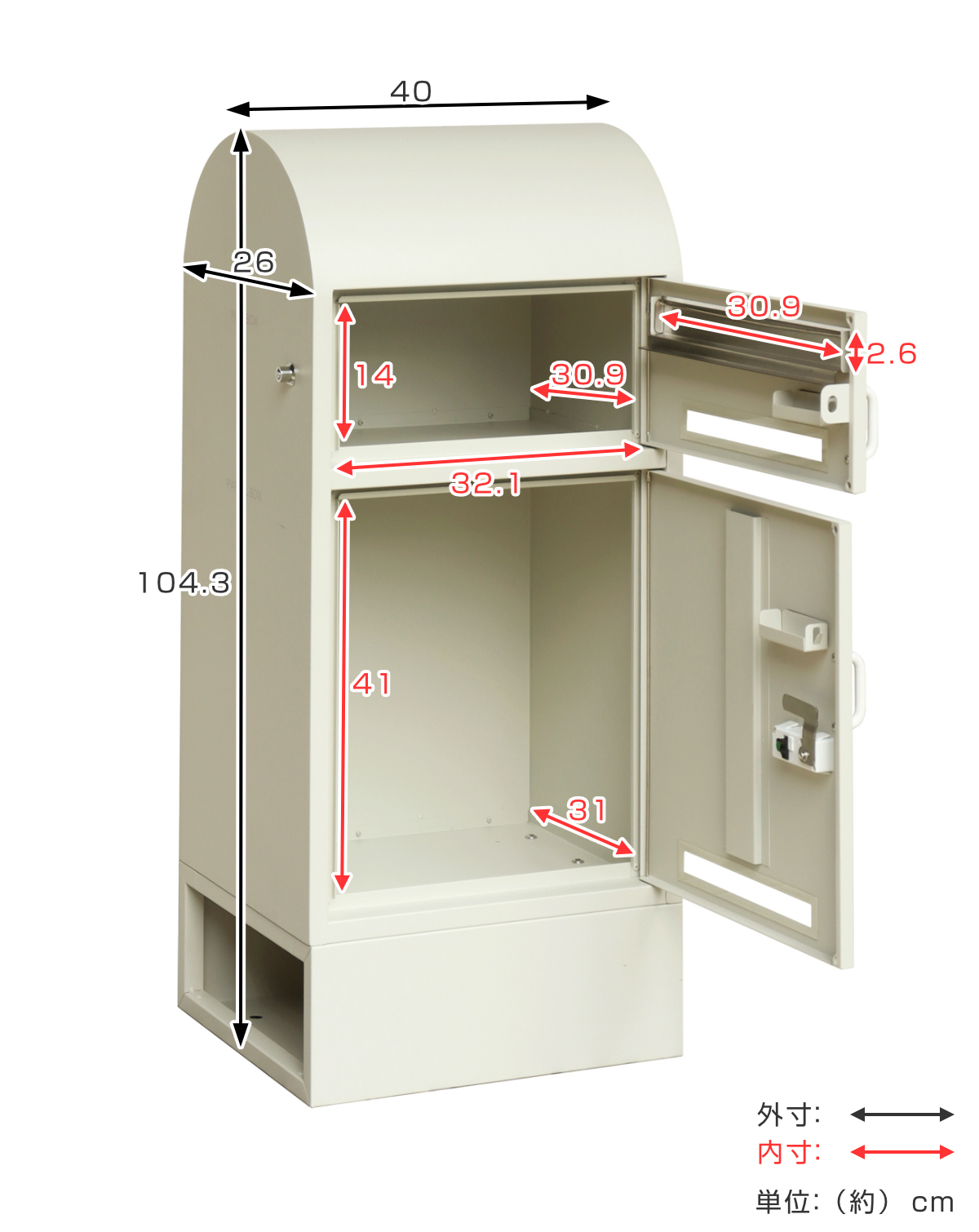 | サイズ | 約 幅40×奥行35×高さ94(cm) 投函口サイズ:約幅30.9×奥行2.6cm 取出口(上段):約幅32.1×奥行30.9×高さ14cm 取出口(下段)約幅32.1×奥行31×高さ41cm |