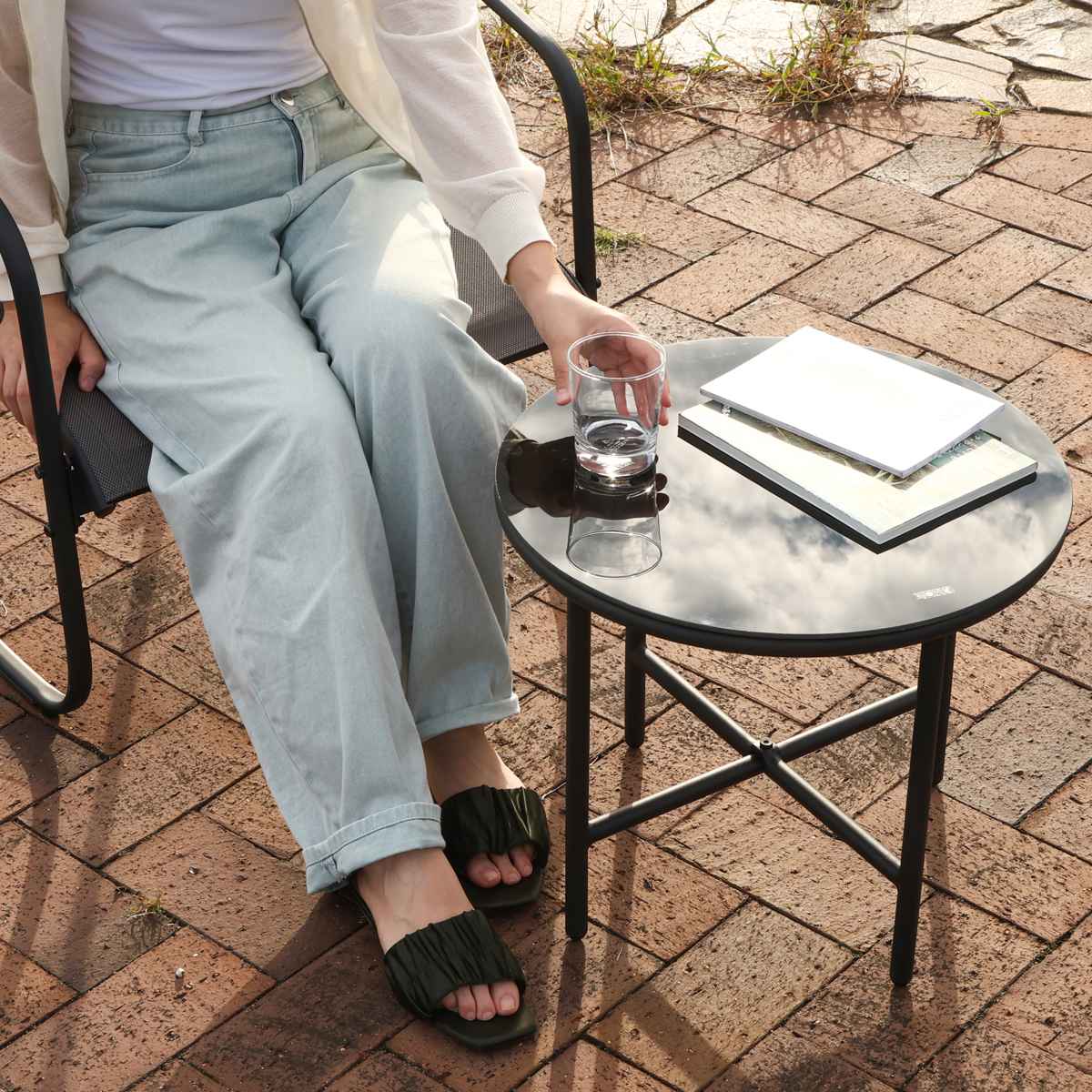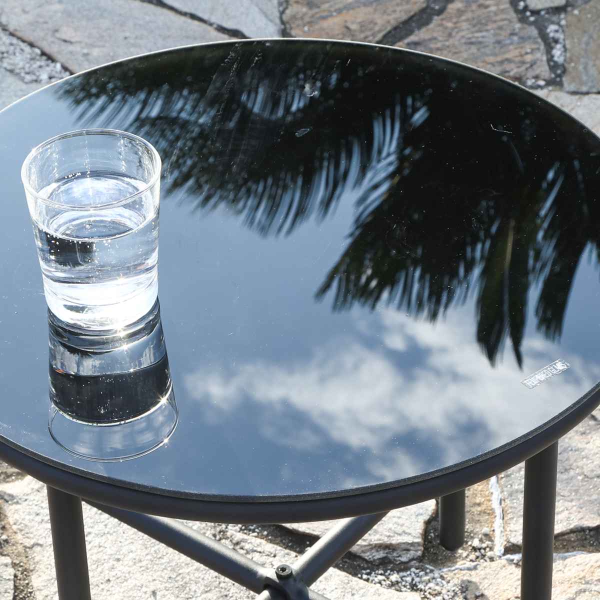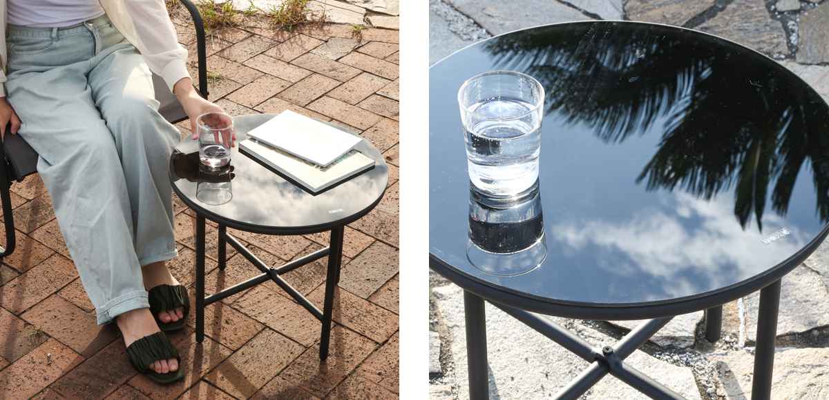 テーブル天板はガラスを使用しているため、空や木々を反射して美しい景色を生み出します。汚れても拭き取りが簡単で、扱いやすいです。