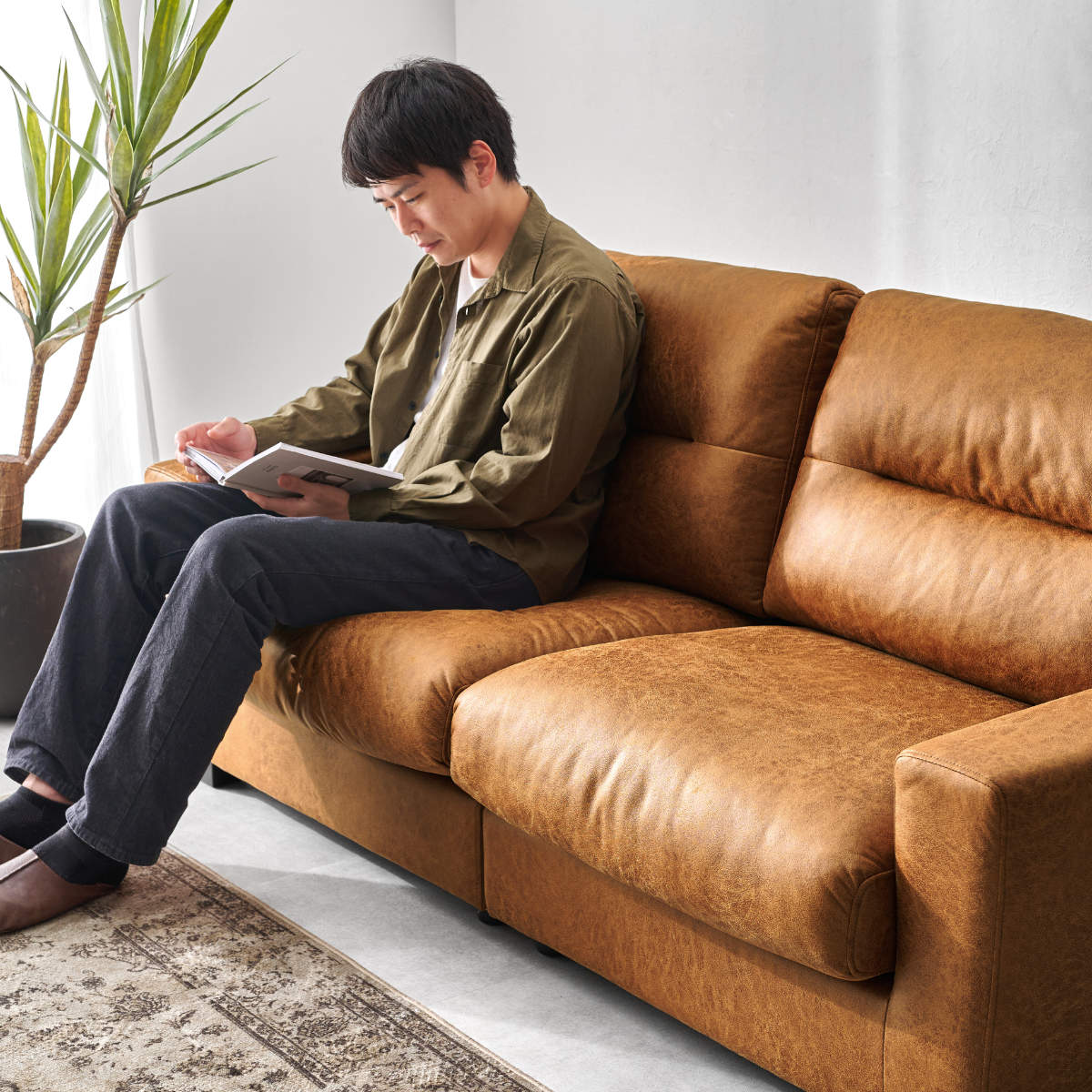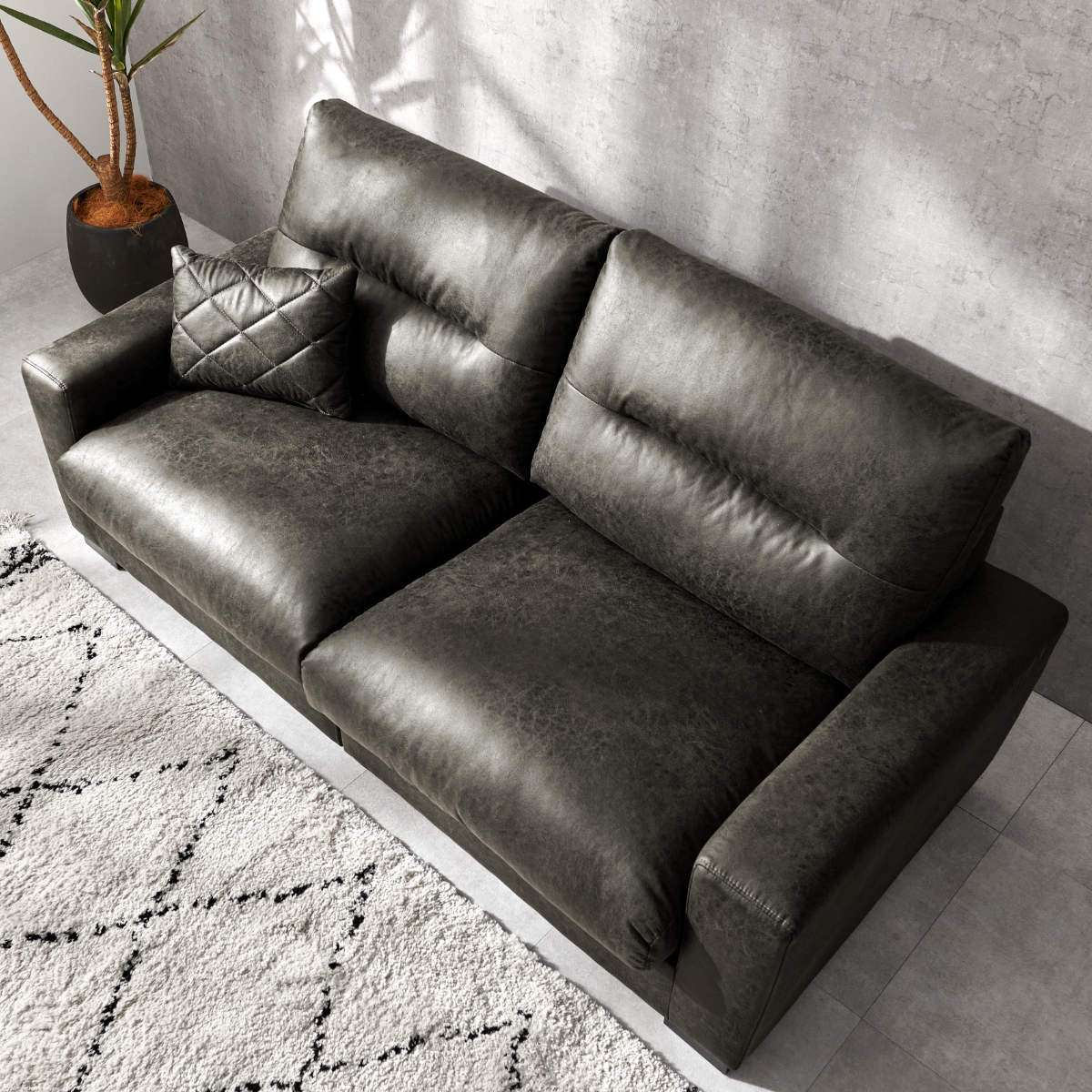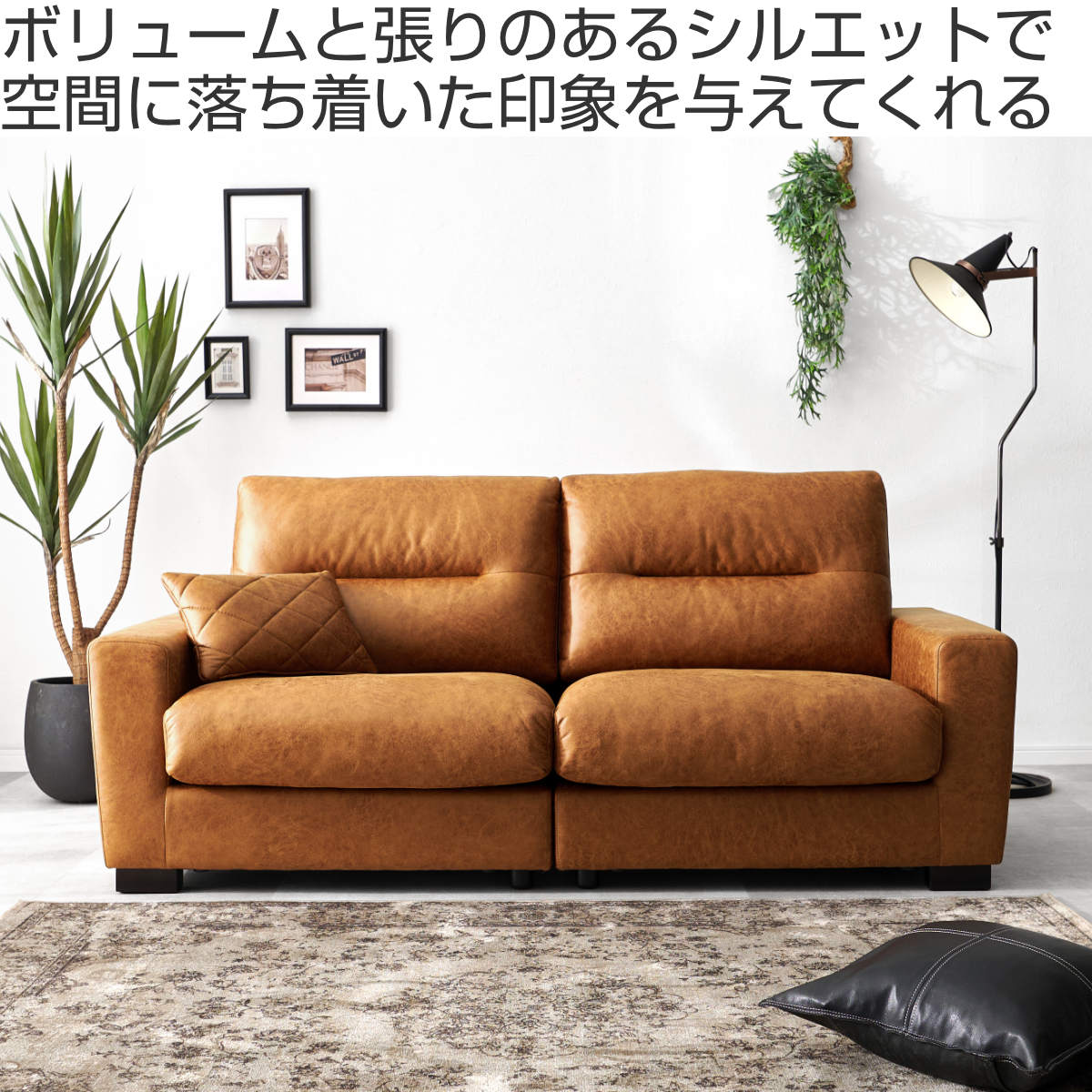 存在感のあるボリュームと張りのあるフォルムが空間を引き締めるヴィンテージレザー調の3人掛けソファ。広々としたワイドな座面で、体格を問わずゆったり身体を預けられ、長時間でも快適にくつろげます。
