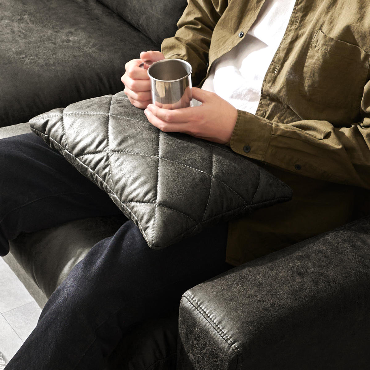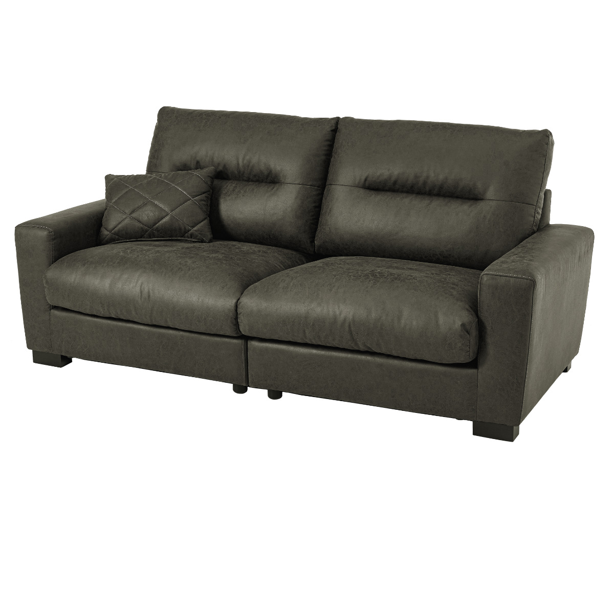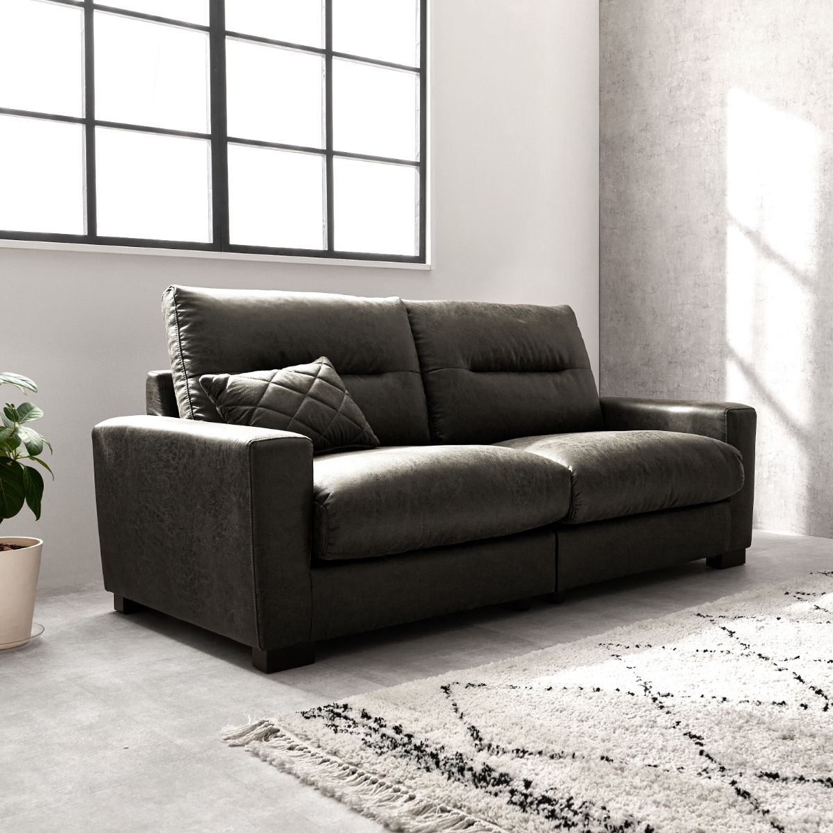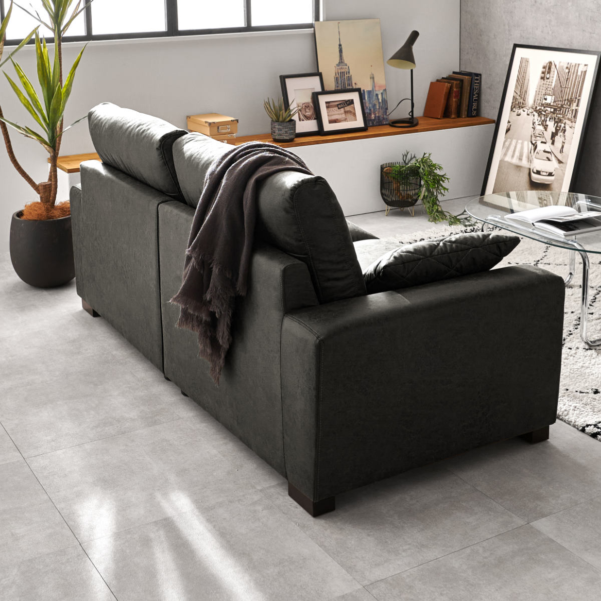 存在感のあるボリュームと張りのあるフォルムが空間を引き締めるヴィンテージレザー調の3人掛けソファ。広々としたワイドな座面で、体格を問わずゆったり身体を預けられ、長時間でも快適にくつろげます。