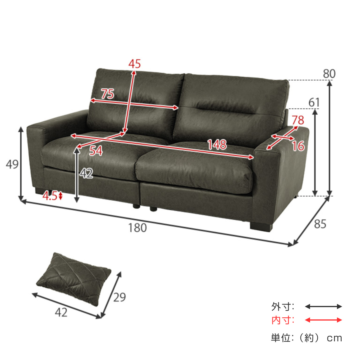 | サイズ | 約 幅180×奥行85×高さ80(cm) 座面高:約 42(cm) |