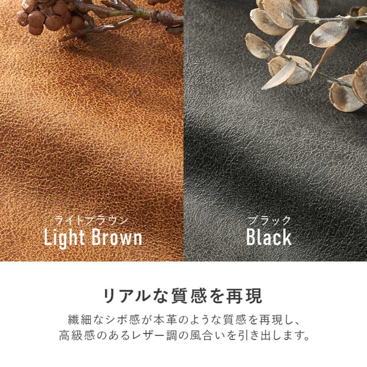 細かなシボ加工により、本革のような質感を再現。上質で高級感のあるレザー調の風合いを楽しめます。