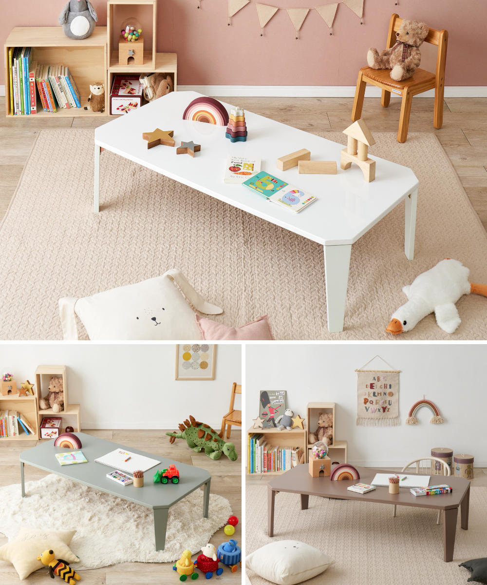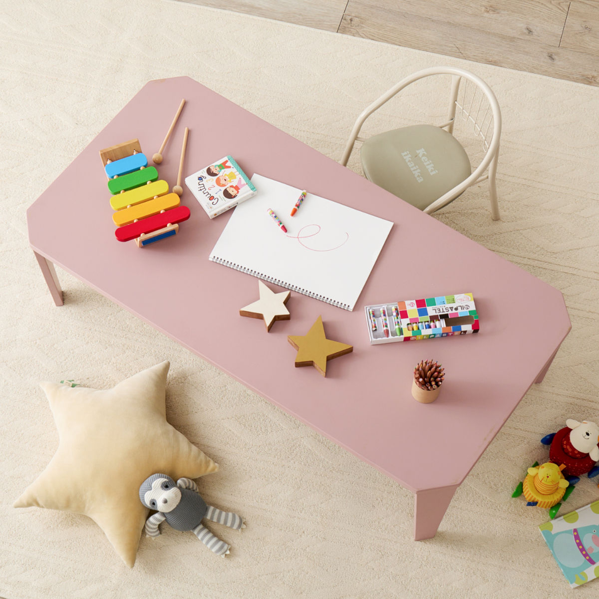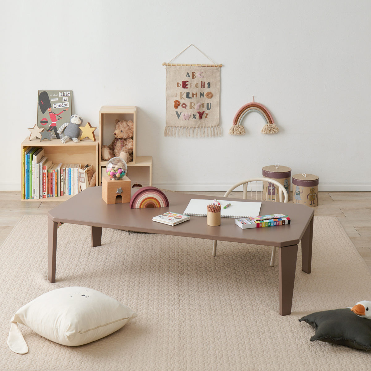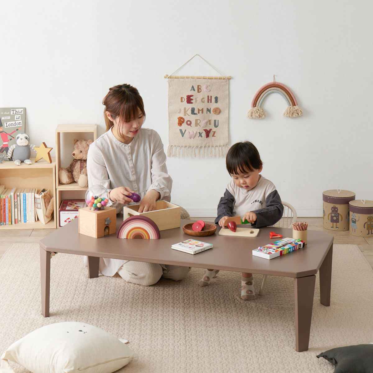 お絵かきやブロック遊び、おやつタイムまで、子どものわくわくに寄り添うテーブル。小さなお子さまも使いやすく、キッズチェアを組み合わせたり床に座ってもちょうどいい高さです。