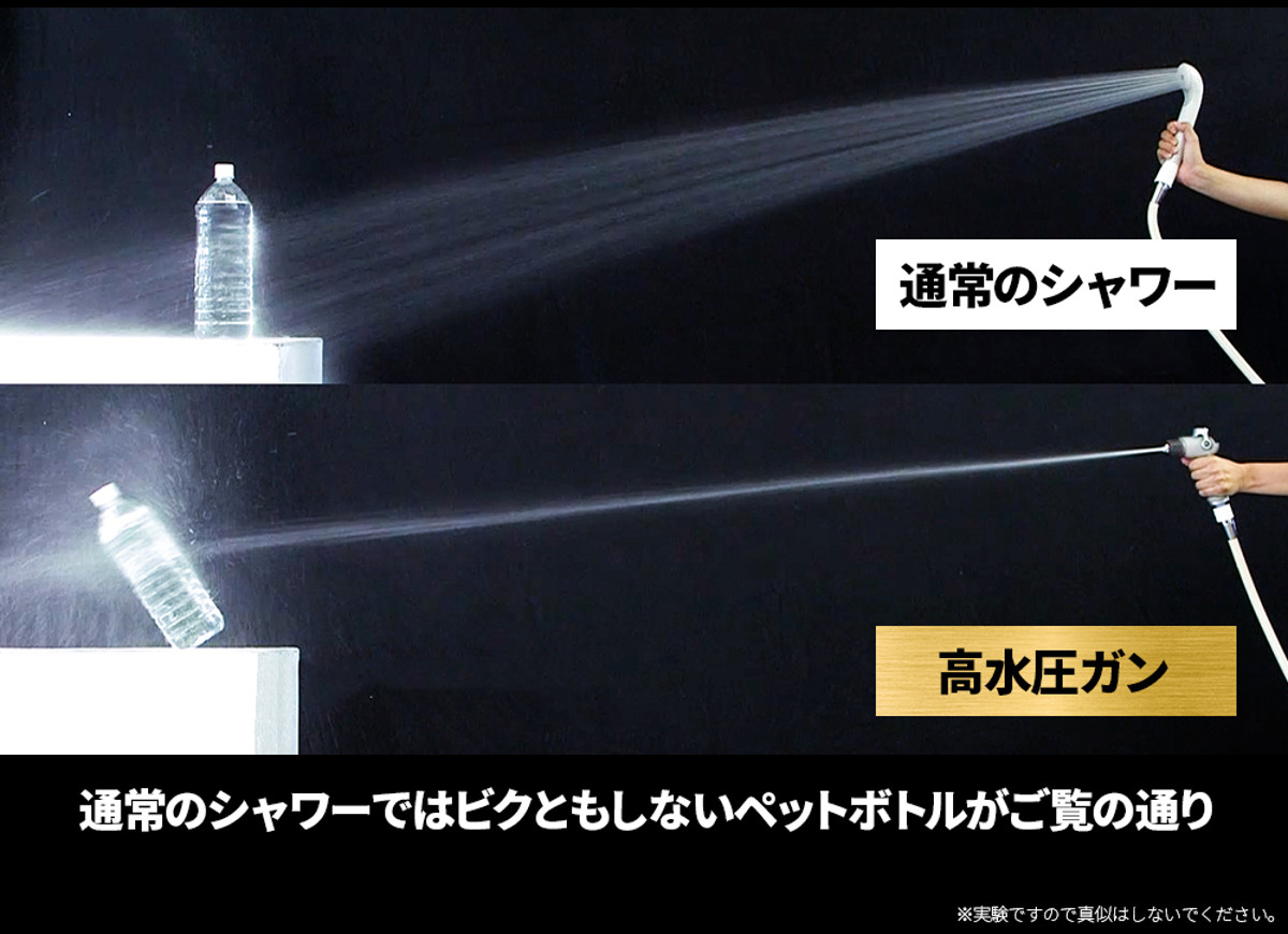水入りのペットボトルに、シャワーの水をあてた場合と高水圧ガンをあてた場合を比較しました。