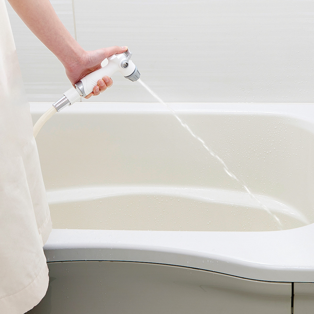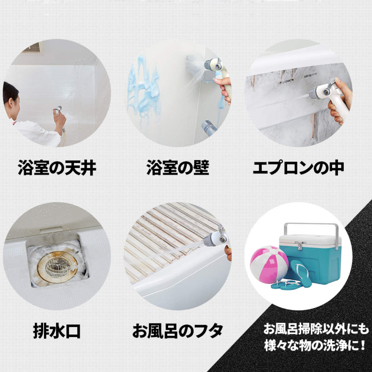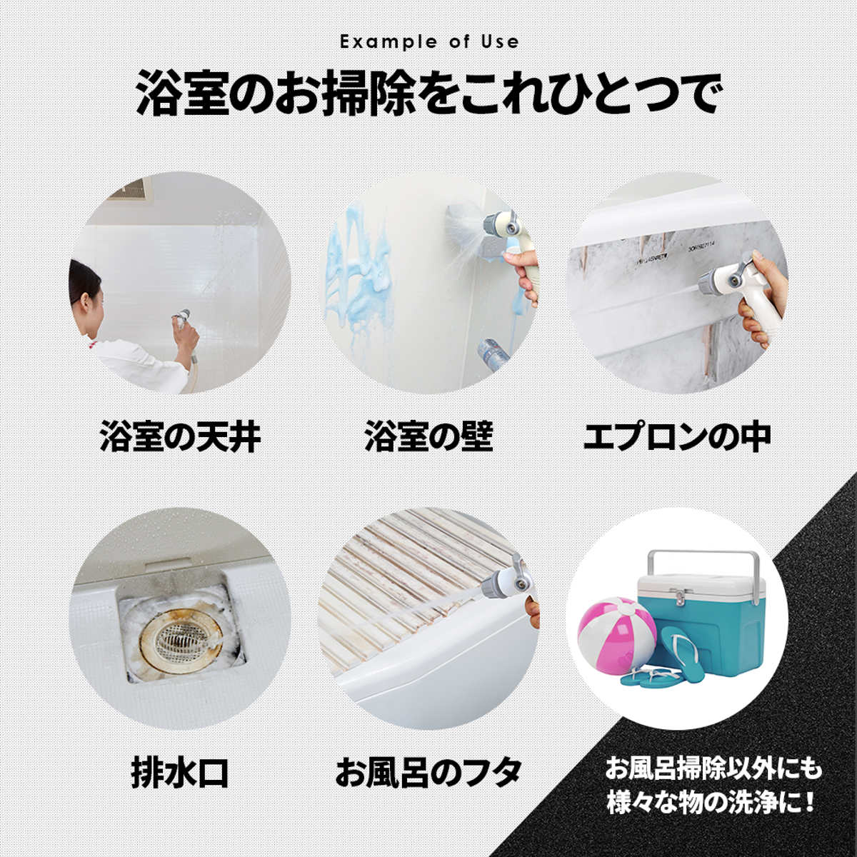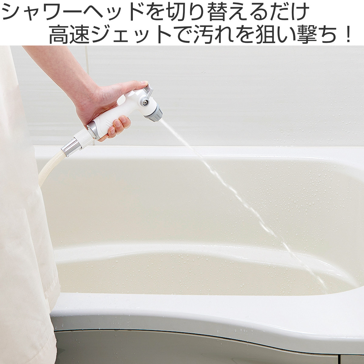 お使いのシャワーヘッドを切り替えるだけで、簡単に浴室をジェット水流で洗浄できる高水圧ガンです。強い水圧で排水口から浴室の床まで一気にキレイにできます。
