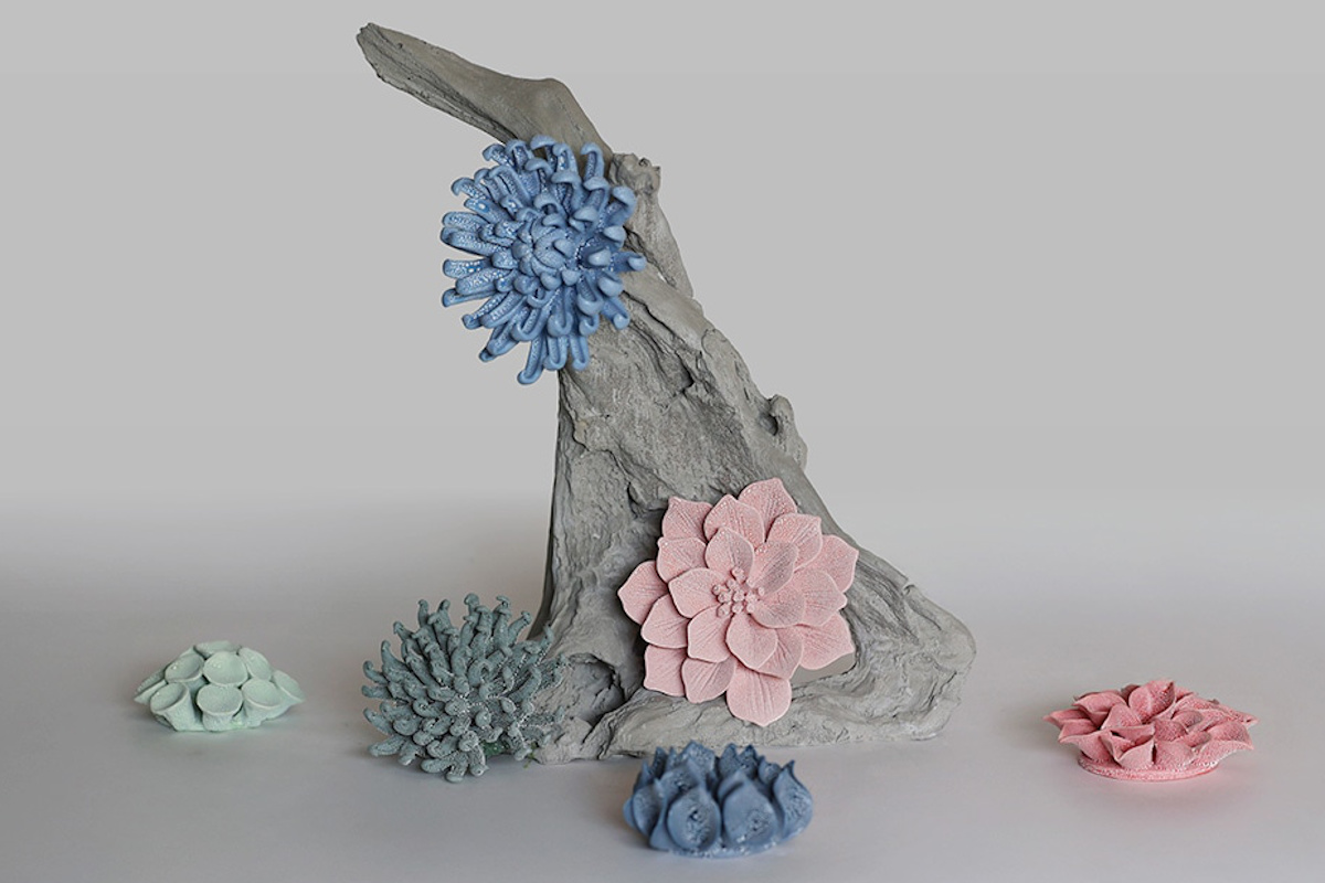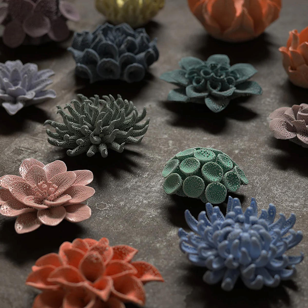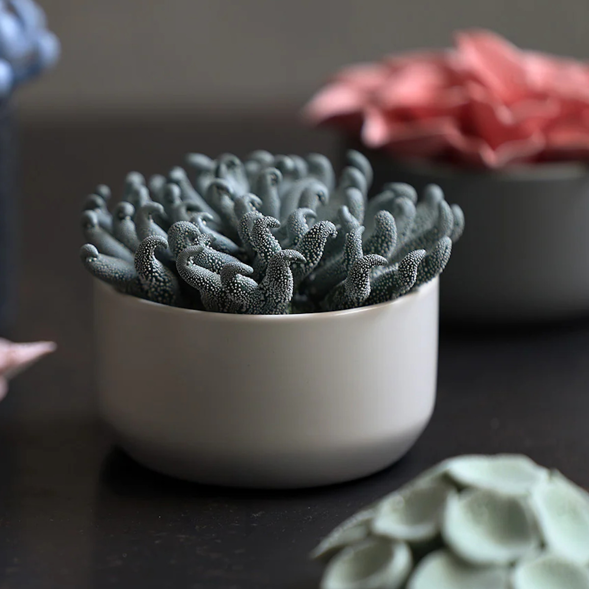 花びらの数や大きさ、粒のバランスは一つ一つ手作りのため、同じものは存在しません。まるで未知の植物を思わせるフォルムに、白く粒立つテクスチャーを施し、光を受ける度に繊細な陰影を生み出します。本物のような各々の個性的な魅力を愉しめます。