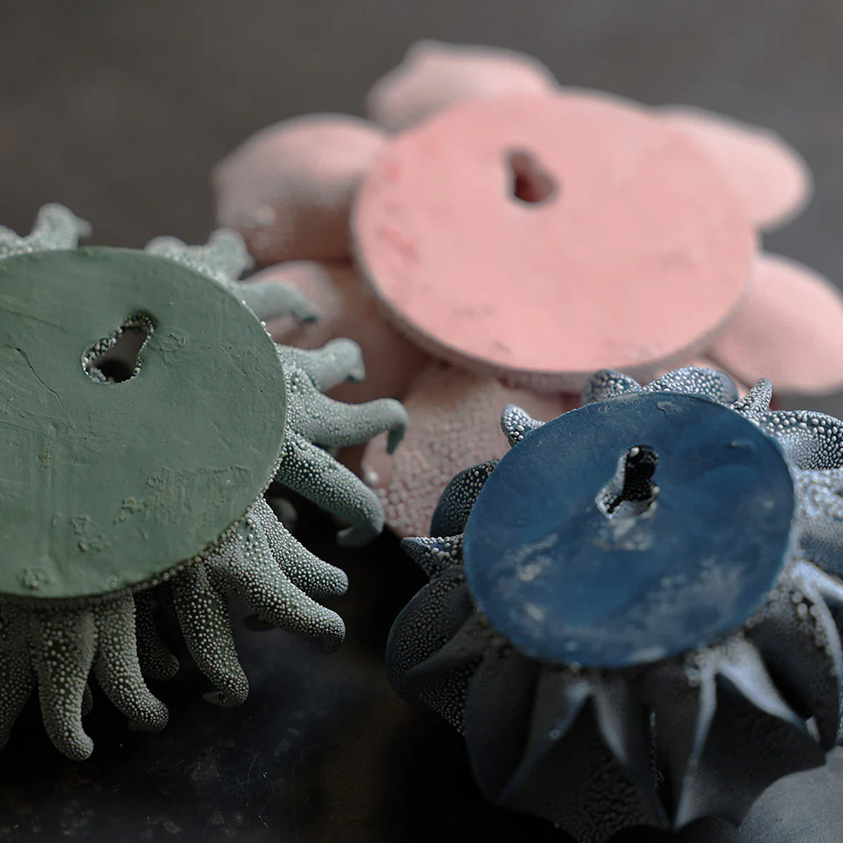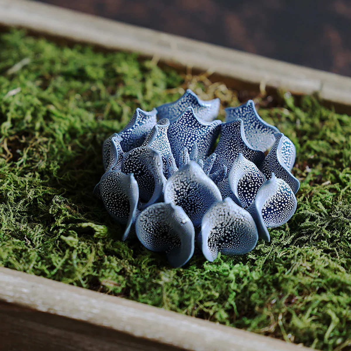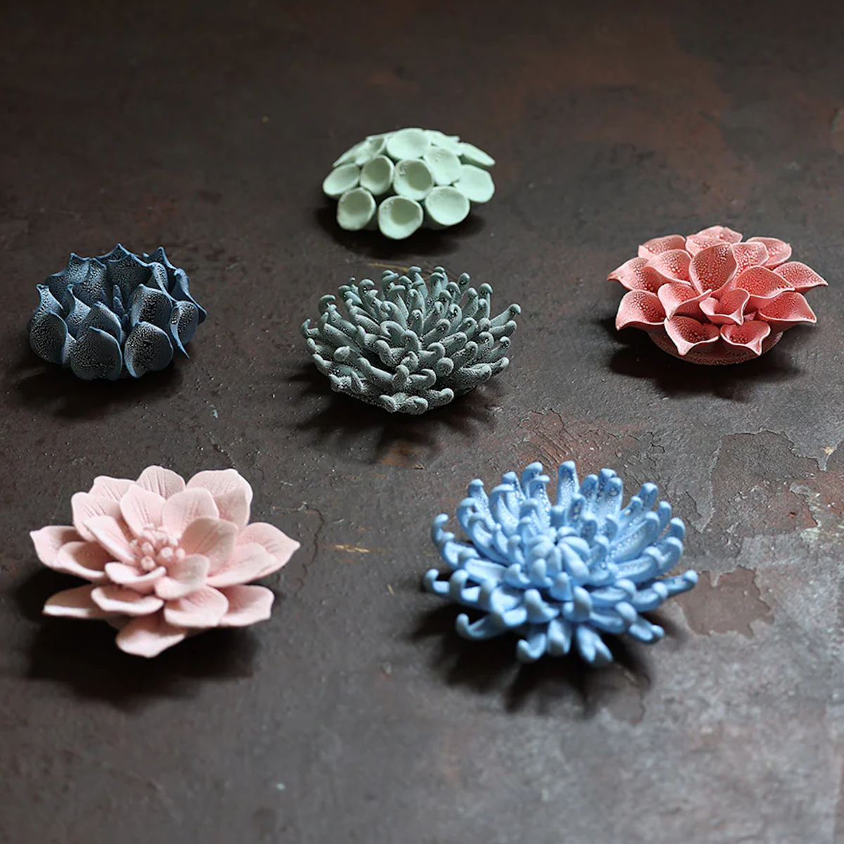 花びらの数や大きさ、粒のバランスは一つ一つ手作りのため、同じものは存在しません。まるで未知の植物を思わせるフォルムに、白く粒立つテクスチャーを施し、光を受ける度に繊細な陰影を生み出します。本物のような各々の個性的な魅力を愉しめます。