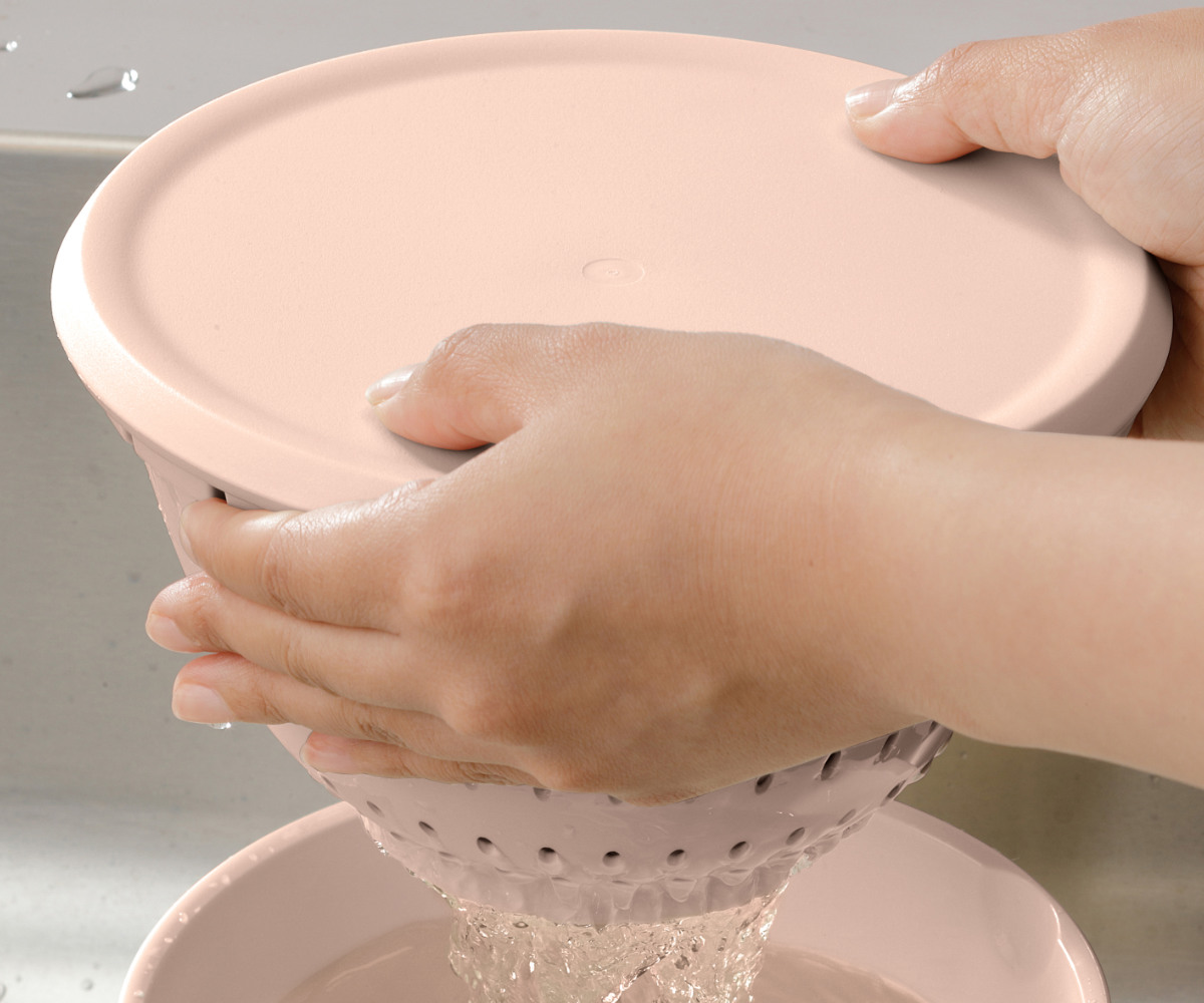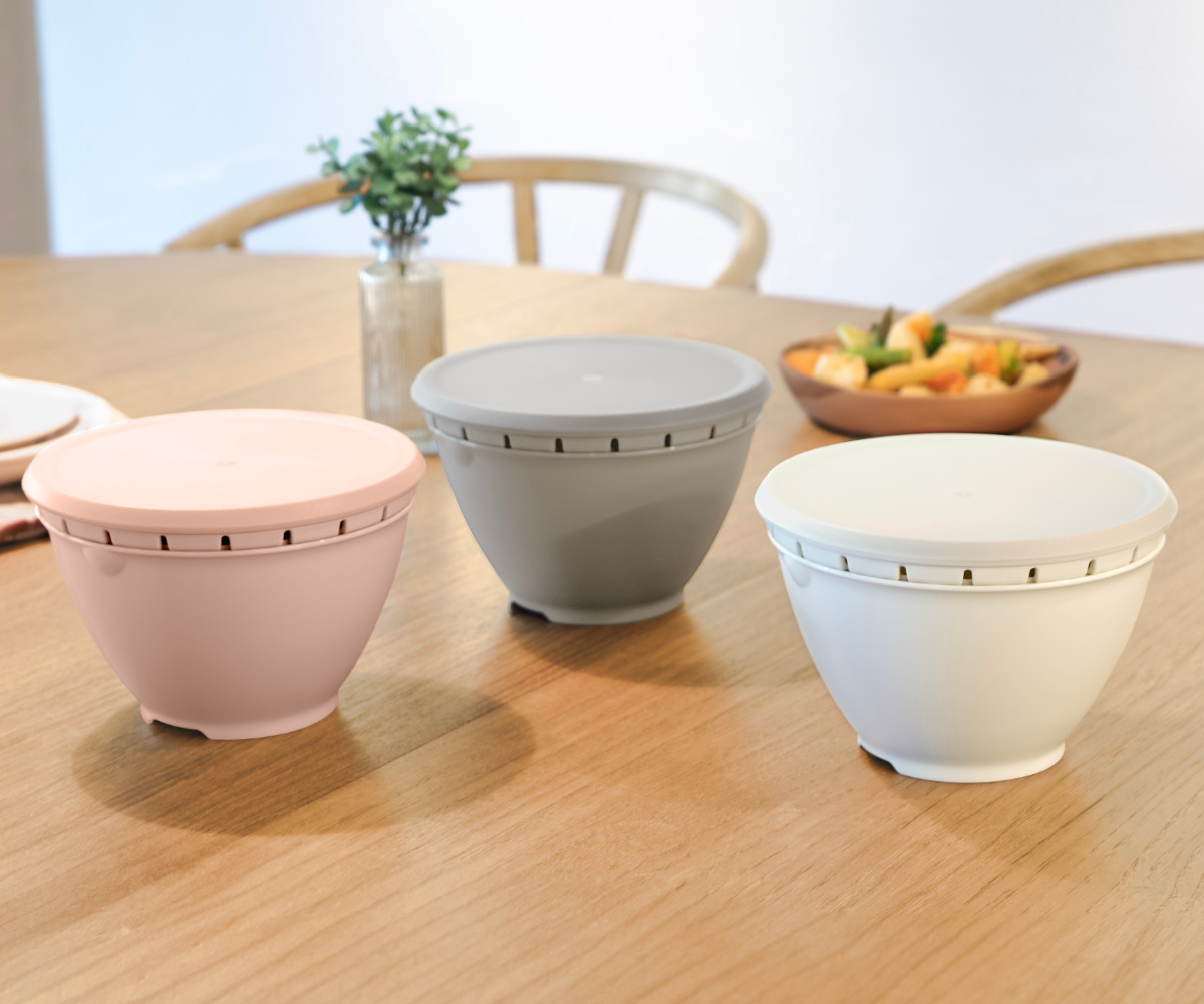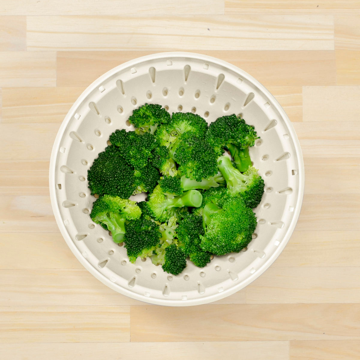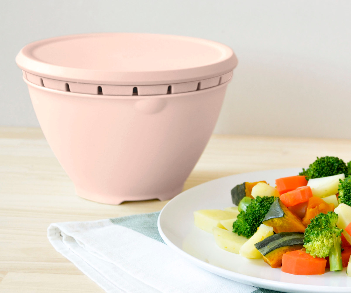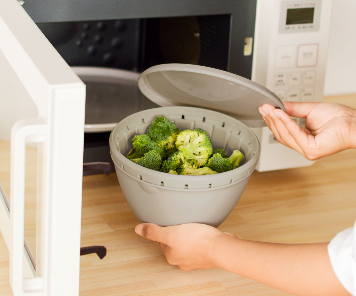 ボウル・コランダー・フタ、まるごと電子レンジで加熱できます。ボウルにセットしたコランダーの中に食材を入れ、フタをしてレンジで加熱すれば、コランダーの穴から余分な水分や油が落ち、温野菜も美味しくでき上がります。