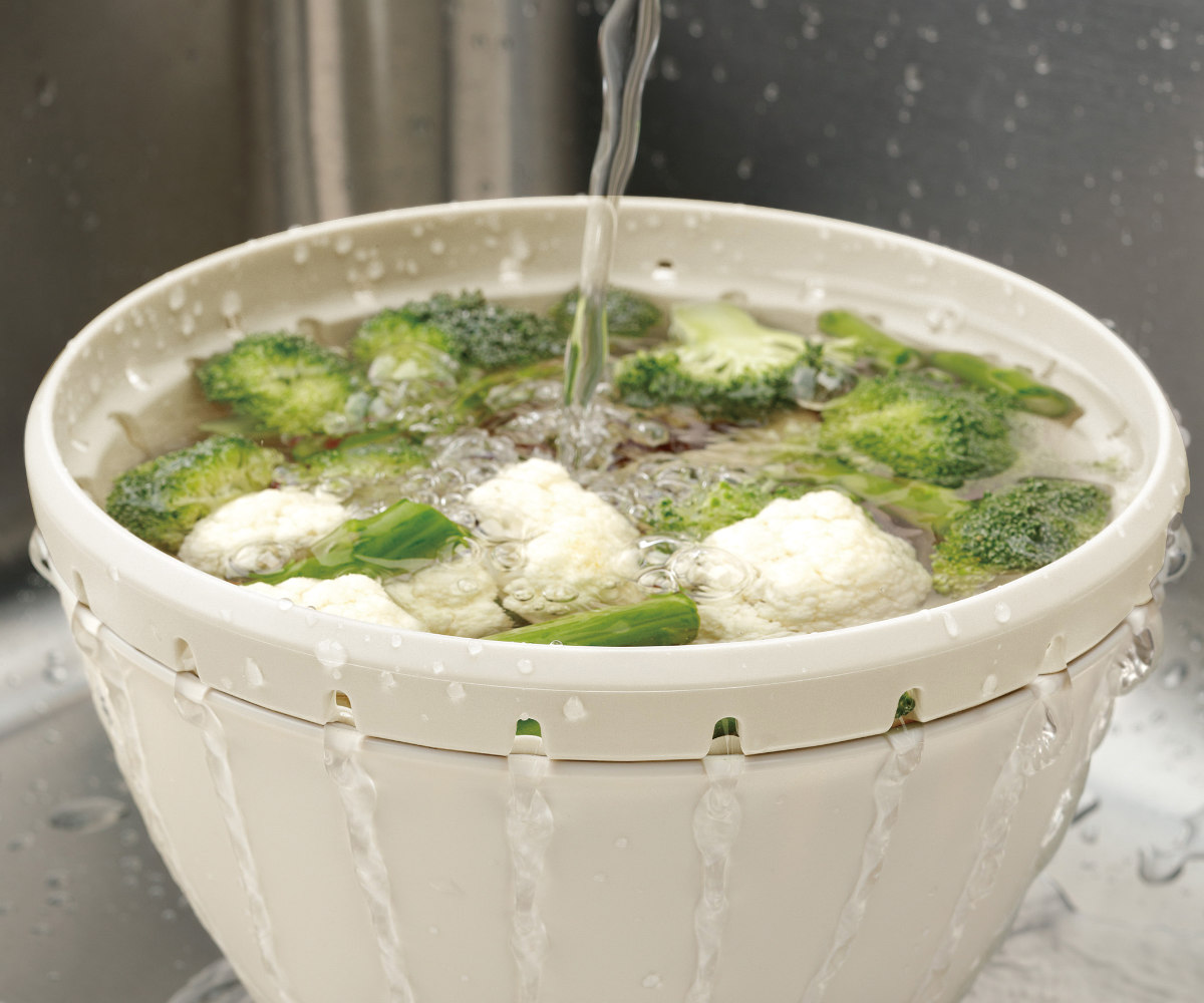 コランダーに空いた穴から水が流れるので、ボウルを重ねたまま水を注いでも食材があふれません。流水解凍にも活躍します。
